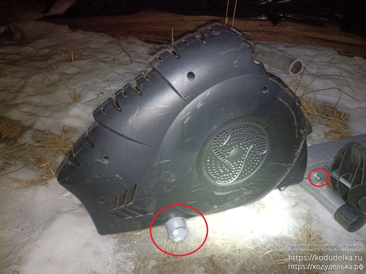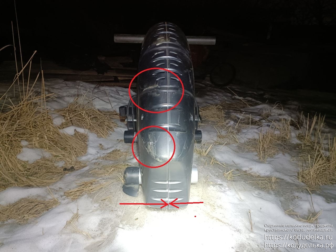Пластмассовый кожух — местами с некоторыми потертостями (обвел красным). И ещё он рассщёлкнулся на две половинки (показал красными стрелками; по шву, заводскому, 2-3 мм теперь зазор), как защелкнуть обратно — не понимаю. Формально в этом ничего сложного быть не должно, но видимо, нужно либо два человека, чтобы это делать, либо свободное ровное пространство, ни того ни другого нет.
