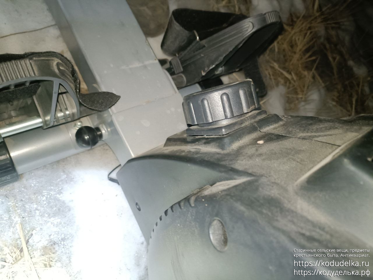 — Посередине тоже есть некое сочленение, там торчит штырь с черным пластмассовым шариком (и стопором с другой стороны; обвёл красным), возможно он нужен чтобы складывать — его не тестил (не понимаю что должно получится, и боюсь сломать. да и тяжелый он, в одного не справлюсь)