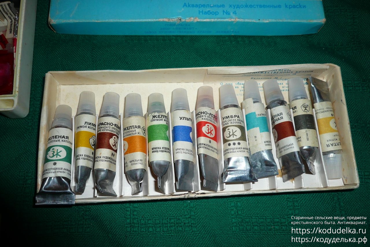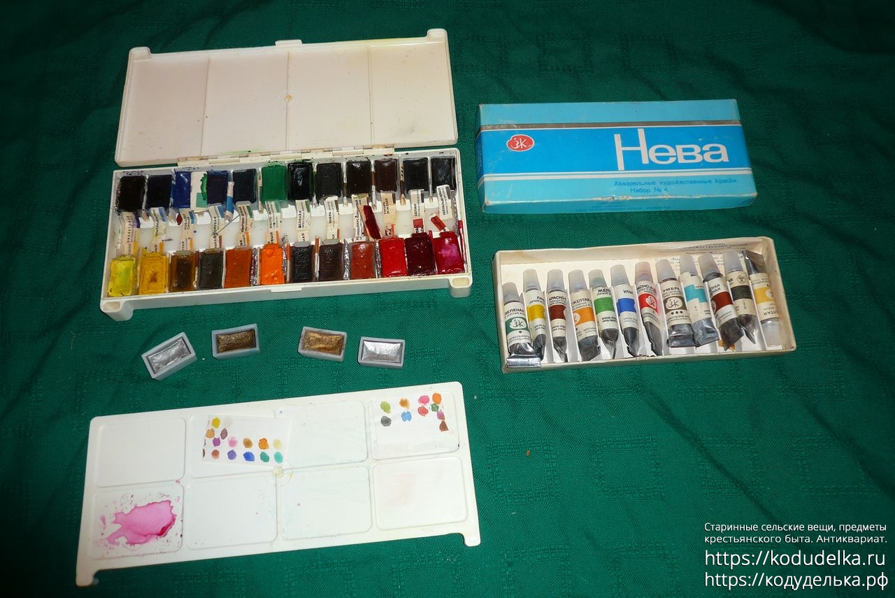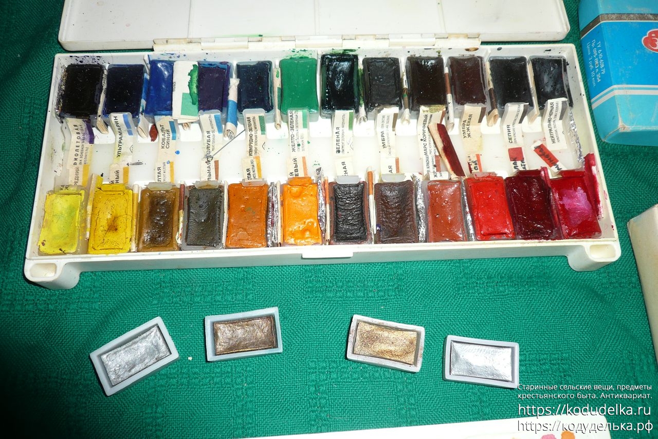 1) Акварельные (?) художественные краски СССР, набор из 24 цветов в пластмассовом футляре, те что слева. + 4 тюбика дополнительных (из другого набора ?)