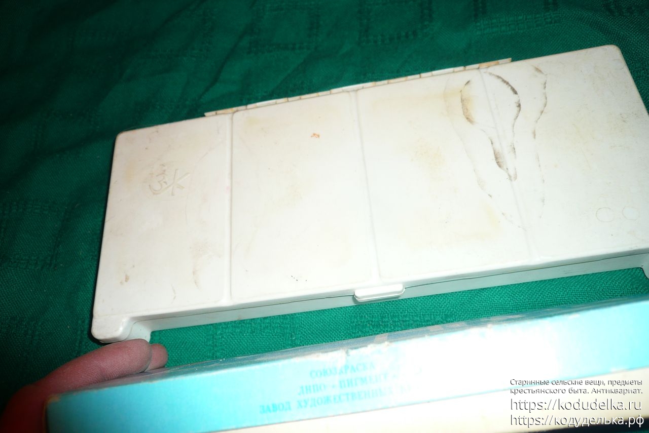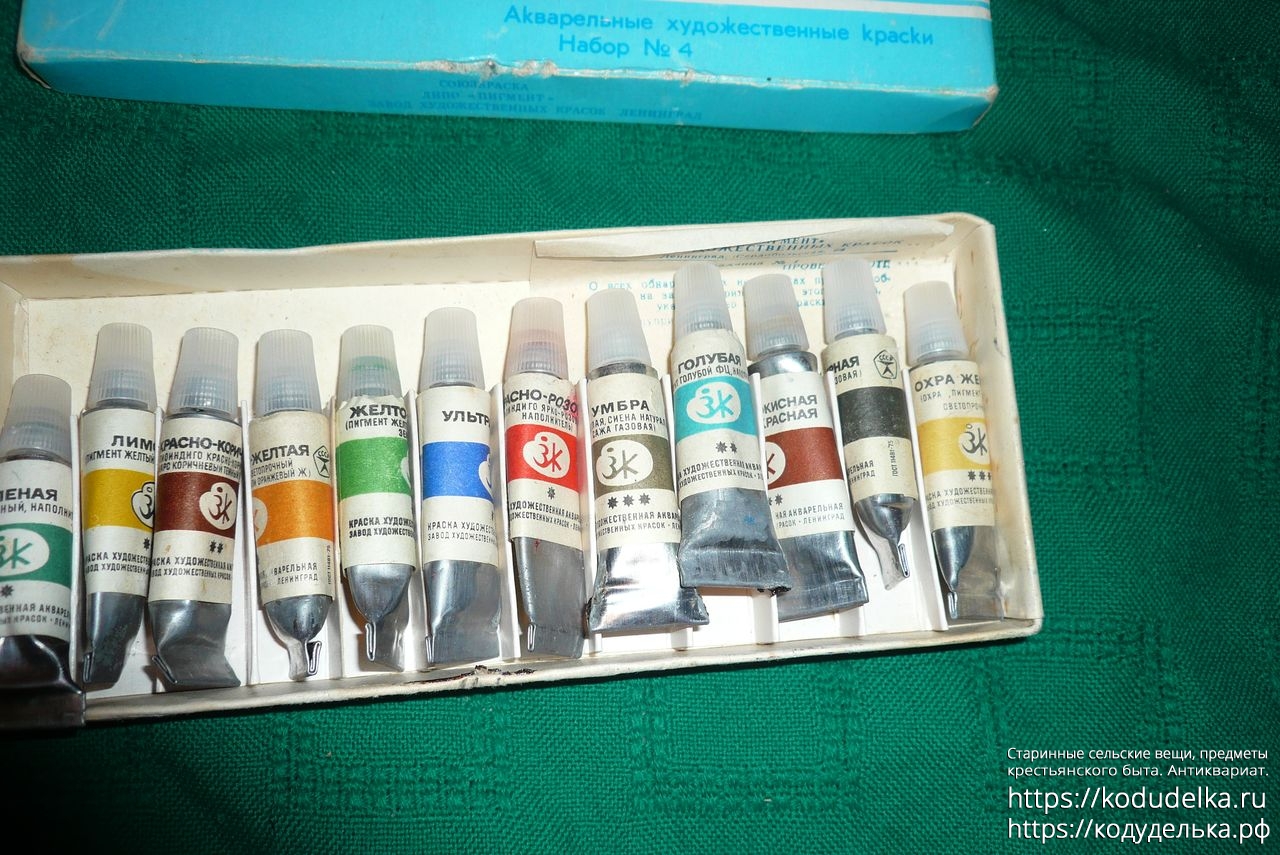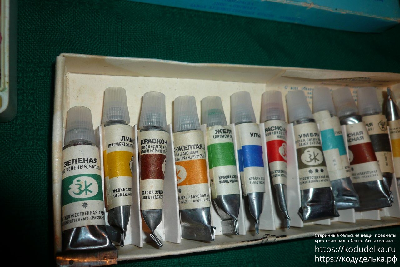 1) Акварельные (?) художественные краски СССР, набор из 24 цветов в пластмассовом футляре, те что слева. + 4 тюбика дополнительных (из другого набора ?)