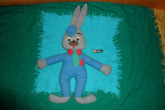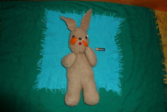 Мягкая игрушка Заяц, из СССР (?) Весь мягкий. Снаружи ткань, материал набивки наверняка неизвестен (точно не сено и не опилки)…