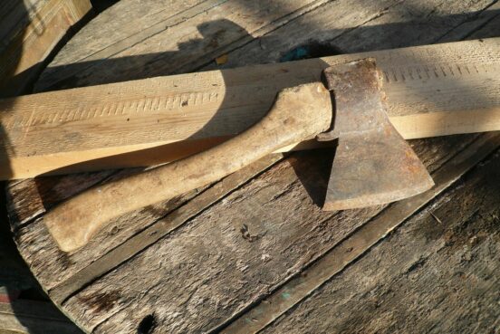 Плотницкий топор с топорищем, расклинен и готов к работе.