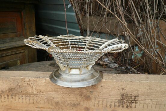 Фруктовница (хлебница, конфетница) СССР, из алюминия золотистого цвета. Клеймо — МЗМ г. Мытищи Есть разрыв проволоки на «внешнем кольце» (отметил…