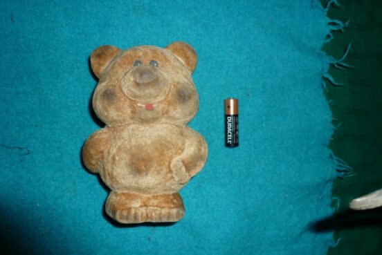Попался небольшой мишка, советская игрушка. Снаружи — основная версия — что это не плюш, а велюр. Внутри, возможно, прессованный (?)…
