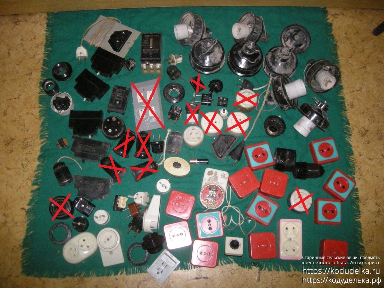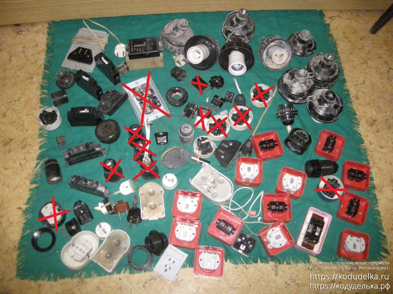 Многочисленные электроэлементы СССР: автоматы, вилки, розетки и элементы цоколей, цоколи, кнопки включения-выключения, одна телефонная розетка, один динамик для телефонной трубки, кнопка звонка и т.п.