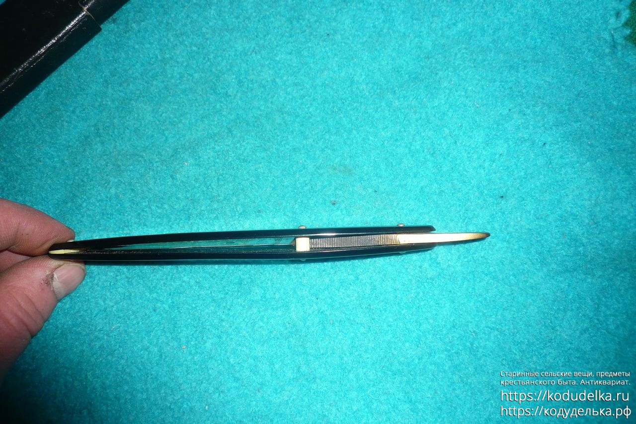 UPD: основная версия — всё-таки 4 полукружья — это не заводская форма лезвия, а кто-то самостоятельно ажурно устранял скол на лезвии, а то, что на последнем малом полукружьи есть ещё скол — либо оно сразу так получилось при перетачивании, либо уже от дальнейшей эксплуатации. учтено в цене