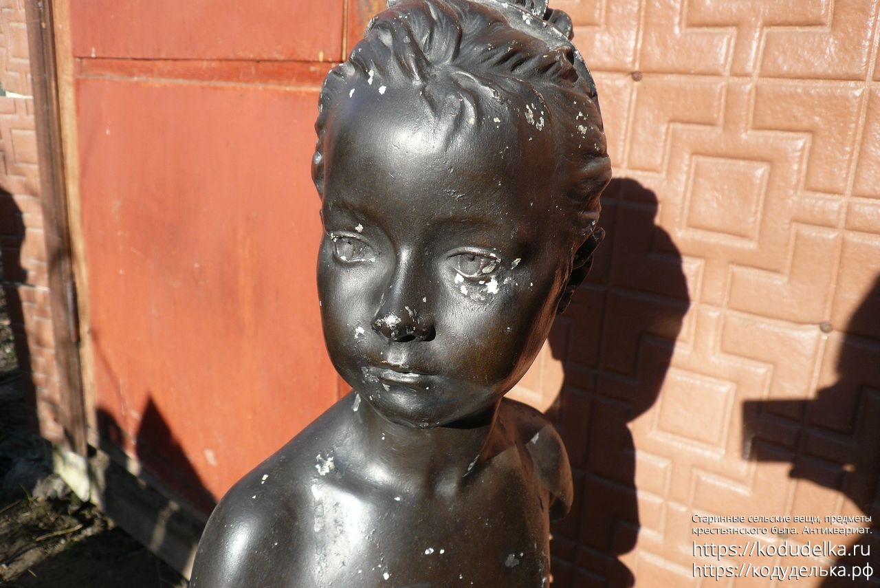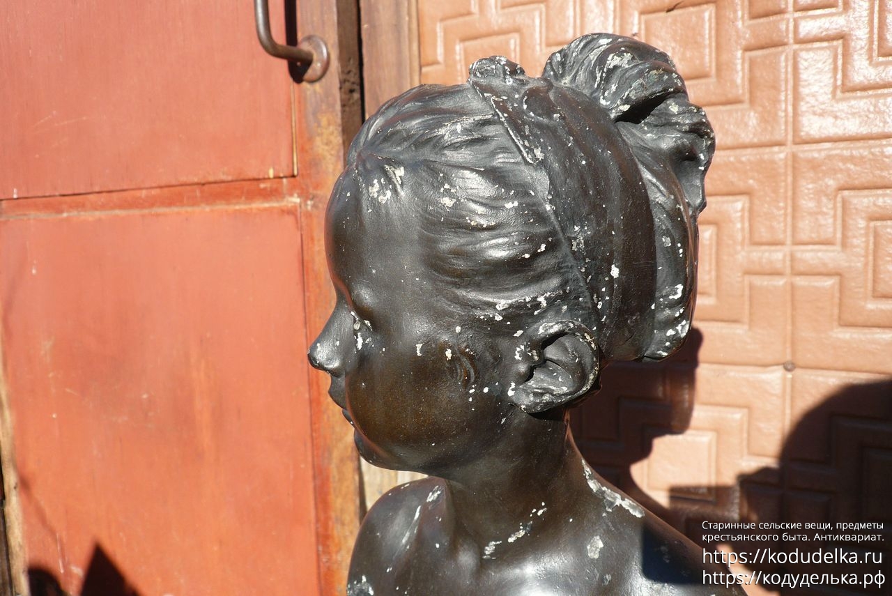 Есть небольшая дырочка в ухе — возможно, вскрылась изначальная раковина при отливке, похожая дырочка есть в волосах сзади.