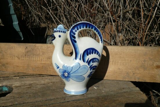 Винтажный фарфоровый кувшин-штоф «Петух», расписанный в традиционном стиле Гжель, советских времён. На обороте — клеймо Гжель и цена в рублях-копейках….