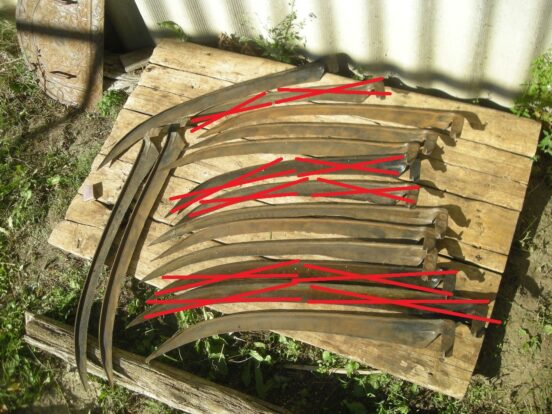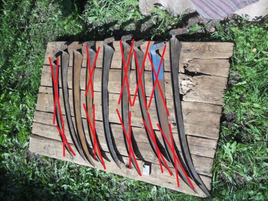 Советские косы, б/у. Есть зазубрины на лезвии // сточенность. Как по мне — вполне рабочие, сам подобной косой кошу уже…