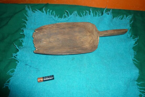Деревянный совок, в сравнительно хорошем сохране. На рабочей кромке есть 2 трещины (на фото).