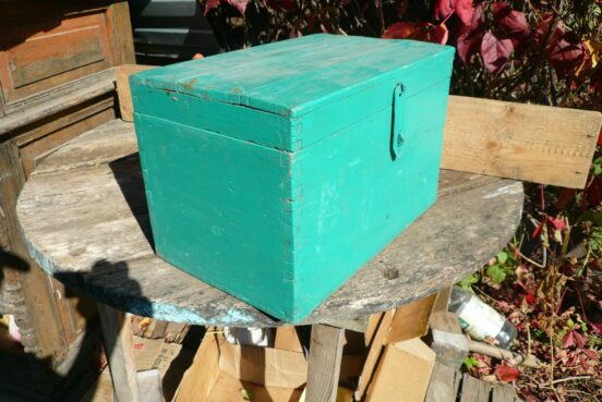Старинный сундучок, малый. Выкрашен зеленой краской снаружи — везде, кроме дна. Размеры: 42/26.5/27.5 см. Пробой и накидная петля с проушиной…