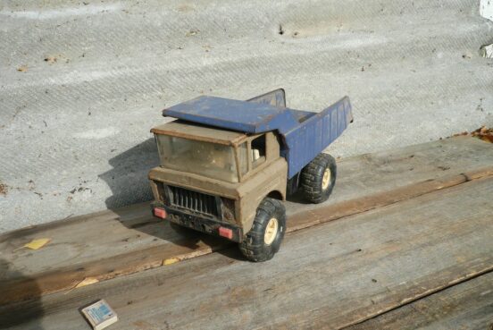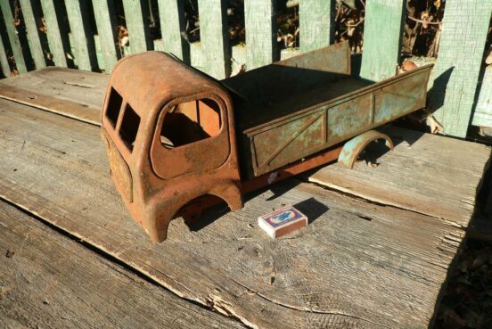 Большая советская жестяная игрушка, игрушечная машина — самосвал, грузовик из жести, на кабине спереди клеймо ЛТЗ. Про утраты писать смысла…