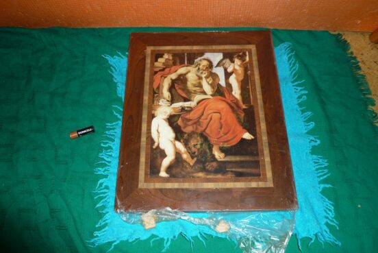 Панно, картина на ДВП (или ДСП), советских времён, на которой изображен (предположительно) святой Иероним, помимо него на картине есть мальчик,…