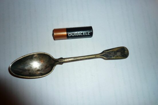 Старинный железный ковшик, металлический, ржавый, с деревянной ручкой. Последняя работа, на которой ковшик использовался — черпать цемент, поэтому внутри ковша…