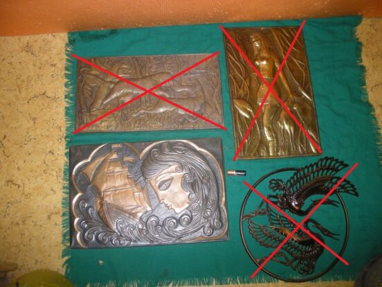 Фанерная табличка с цветком — 250 руб. Фанерная табличка с (предположительно) объемным медным цветком — 500 руб. Обнаженная девушка с…