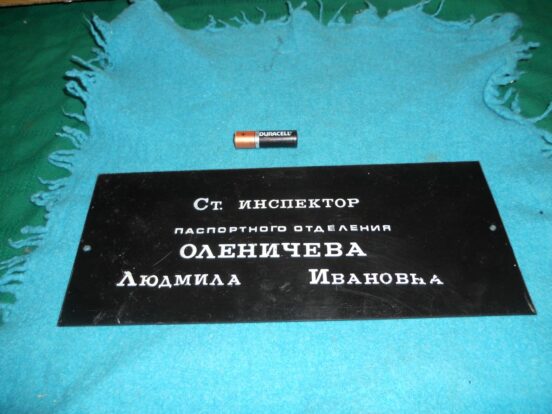 Табличка фамильная Размеры: 12/29 см. Сама надпись: Ст. инспектор паспортного отделения Оленичева Людмила Ивановна