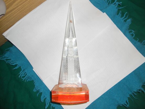 Стелла из оргстекла — Спасская башня Московского Кремля. С дарственной надписью (В День рождения Таисии Дмитриевне 1974). Высота 31.7 см….