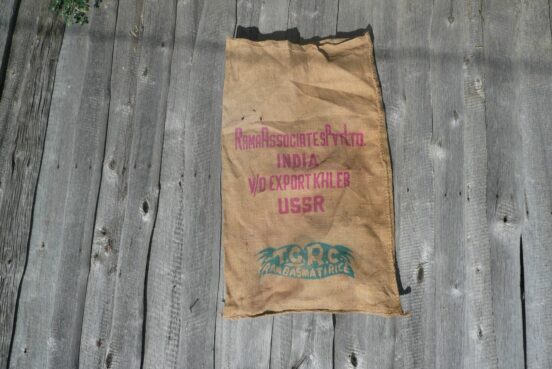 Мешок тканевый — мешковина СССР, экспорт, экспортный. Надписи, с одной стороны: White Indian Basmati Rice Nett Wt. 50 Kgs Gross…