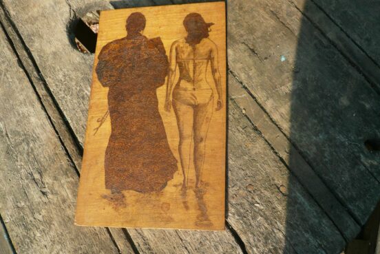 Табличка фанерная с рисунком выжигателем (?? но это не точно, возможно, иной способ нанесения изображения — и вообще она заводская)….