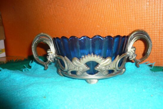 Рельефная ваза (конфетница, сухарница) синего стекла, в силуминовой (дюраль, алюминий) подставке под бронзу. Некоторые называют этот вариант подставки «петушки, петухи»…