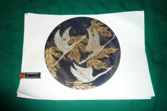 Панно, гравюра на стали — Журавли, Златоуст (?). Диаметр 18 см. Магнитится. Есть потертости и небольшие загрязнения (проступившая ржавчина ?),…