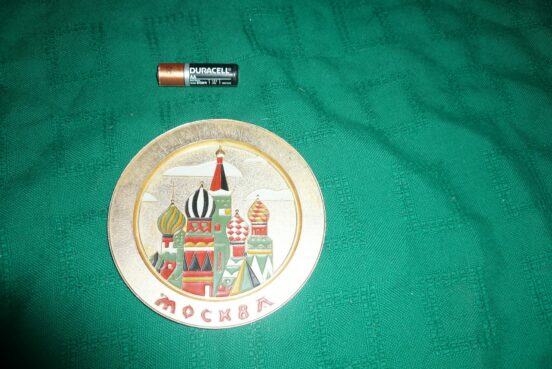 Декоративная тарелка Москва. Дюралюминий, эмаль (?). Диаметр — 12 см. Клеймо: 5мех Ц75к Написал бы «настенная», но сзади нет даже…