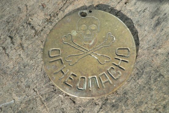 Бирка, жетон, знак, значок, самодельная медаль. Из латуни. Диаметр — 5.5 см. На одной стороне надпись: Огнеопасно, и череп и…