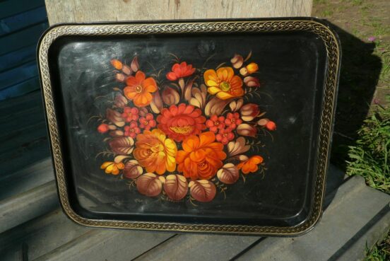 Жостовский поднос советских времён. На подносе авторская роспись, художник Кабичина. Размеры: 35/45 см. К сожалению, есть несколько следов от удара…