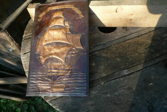Советская медная (?) чеканка с кораблем, с бригантиной. Надписи: 12 Апостолов, 1838 1841 Николаев Размеры: 47.5/28.5 см. Сохран на фото.