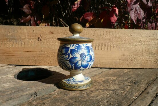 Ваза, вазон деревянный, с росписью очень похожей на гжель, с крышкой Возможно, это солонка или сахарница, под специи, или же…
