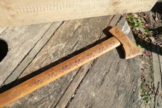 Сувенирный топорик, полностью деревянный (трость?). С орнаментом. Стилизован под бартку (валашку, гуцульский топор). Длина — 92 см. Точные период и…