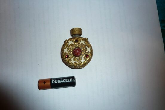 Декоративный красивый, фактурный флакон для духов, вероятно, чешского (богемского) производства (Чехословакия), украшенный эмалью и красными стеклянными «драгоценными» камнями. Сохран на…