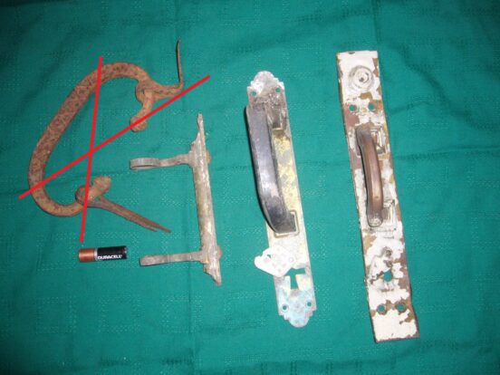 1) Железная кованая ручка с двумя пробоями — продана. 2) Латунная (или медная?) ручка без держателя — 400 руб. 3)…