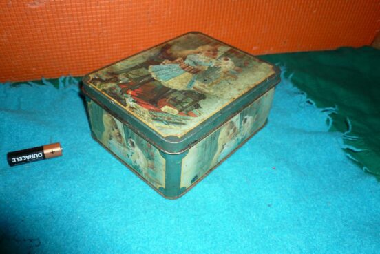 Жестянка, жестяная банка — девочка с кошкой, девочка и кот. Размеры — 17.5/13.7/7.1 см. Предположительно советских времён. Хранился сахар. Сверху…