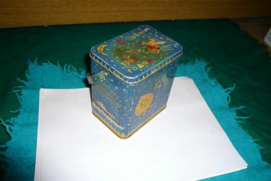 Коробка жестяная Новогодний подарок СССР 1960 год Сохран на фото. Размеры — 12.8/11.7/9 см., без учета ручки. Ручка треснута пополам.