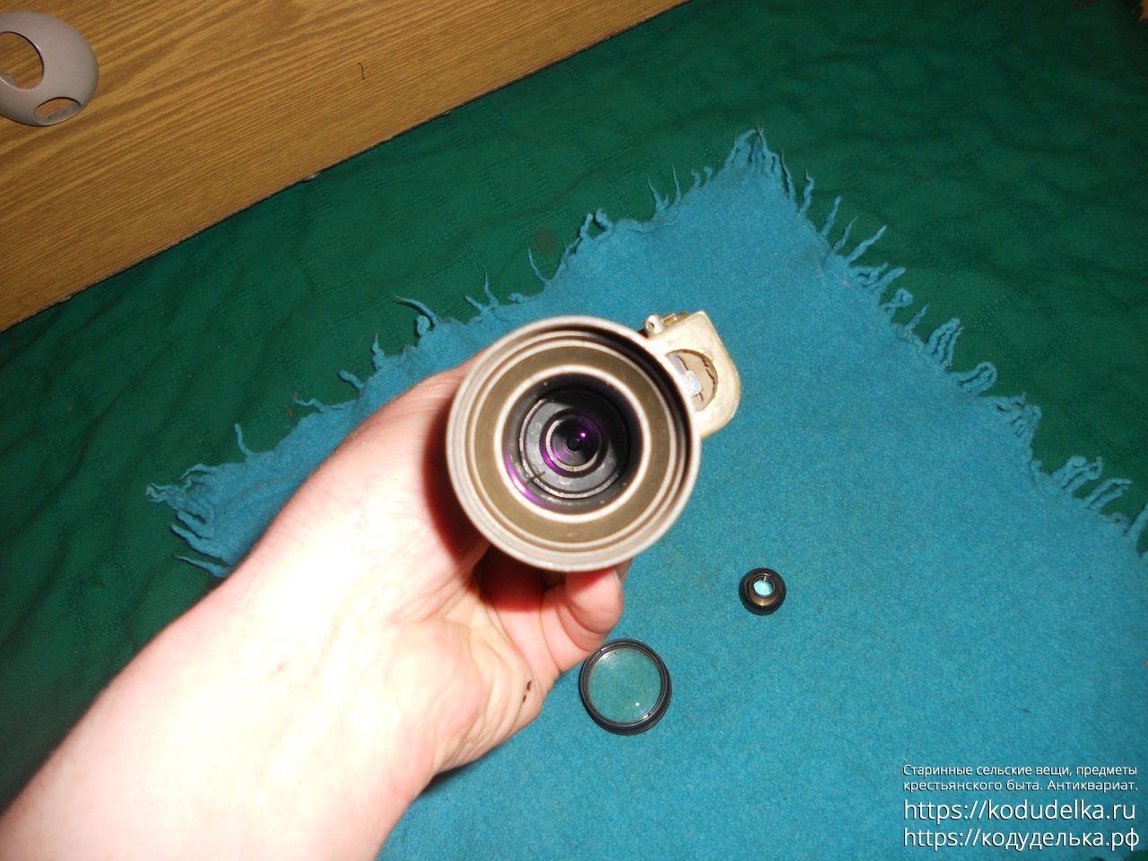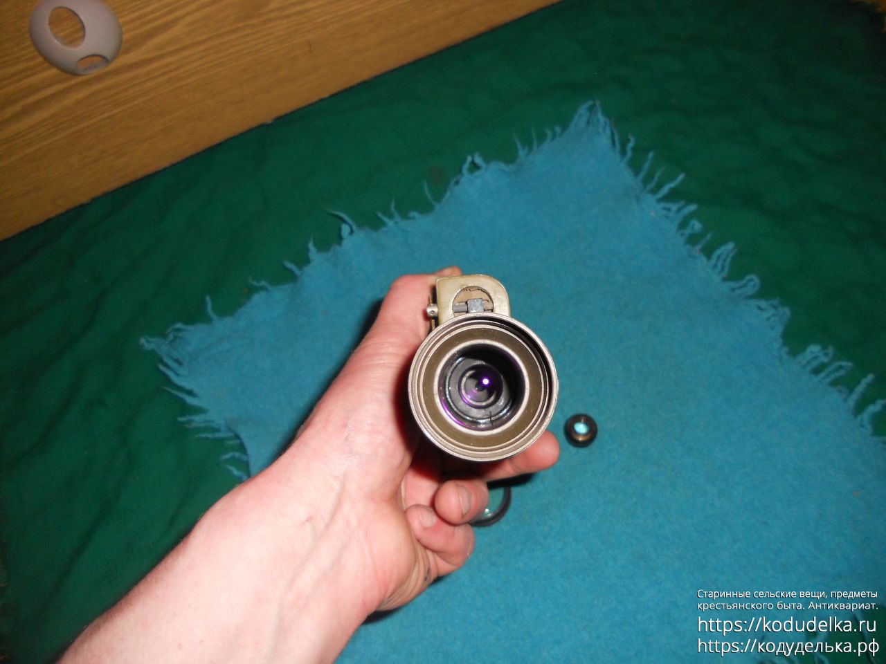 Обе линзы с обеих сторон выкручиваются, если смотреть в каждую по-отдельности — в них перевернутое изображение. Внутри остается еще одна не вынимающаяся линза, которая даёт простое небольшое увеличение. Если смотреть в прибор в собранном виде — ничего не видно.