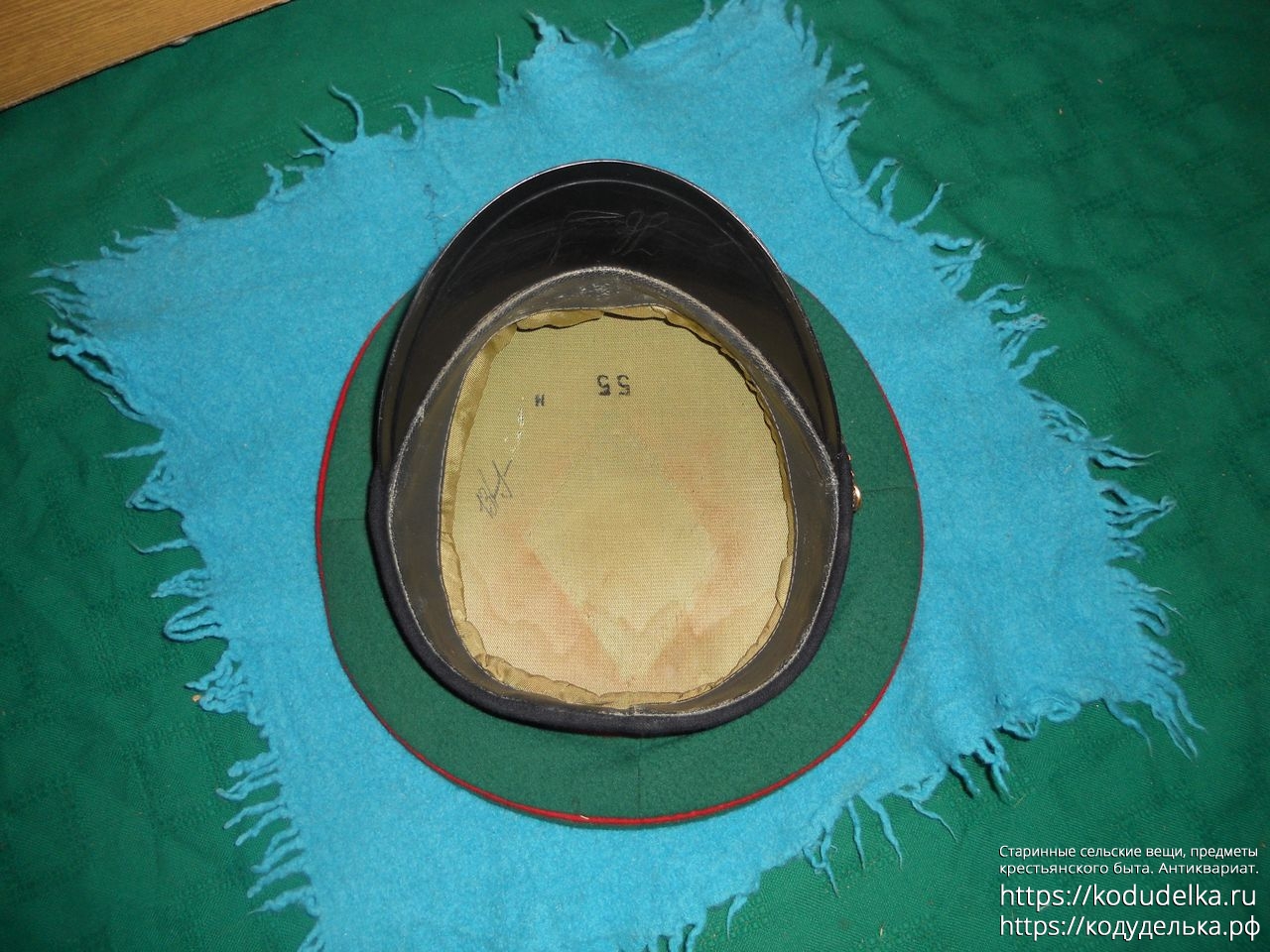 Фуражка зеленого цвета, с красным кантом. С кокардой, на кокадре — пятиконечная звезда и серп и молот и шнур филигранного витья.