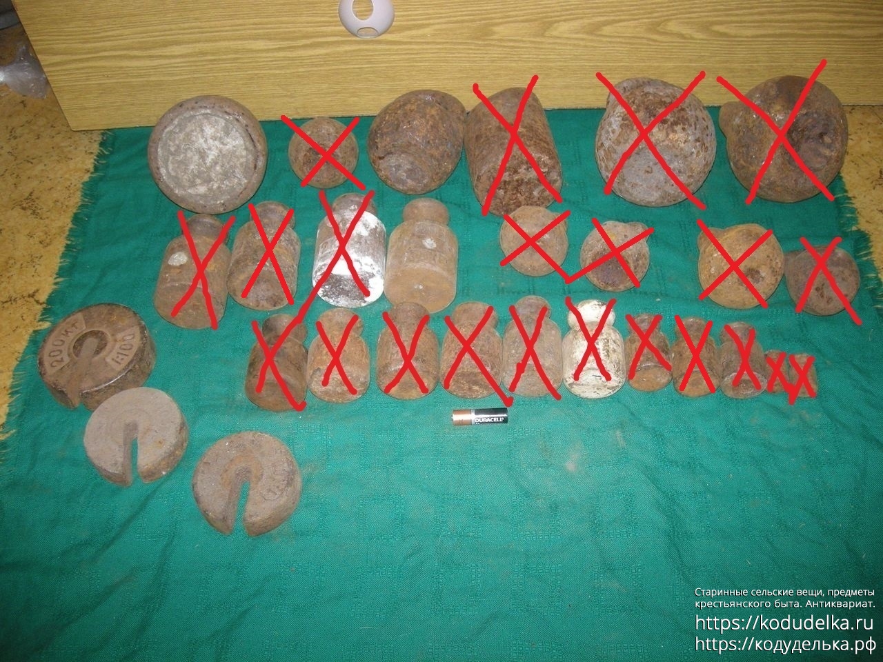1) Гиря непонятной формы, на общем фото в верхнем ряду крайняя слева, похожая на элемент трансформатора (внизу, в дне, помимо железки какая-то белая пластмасса, но по словам соседа, это тоже весовая гирька. Вес порядка 3.5 кг — 300 руб.