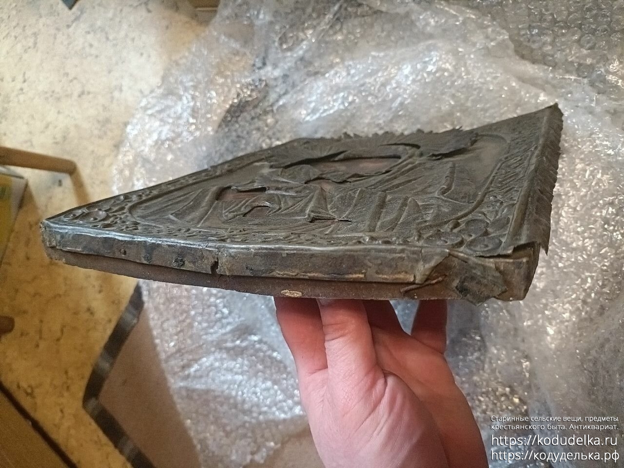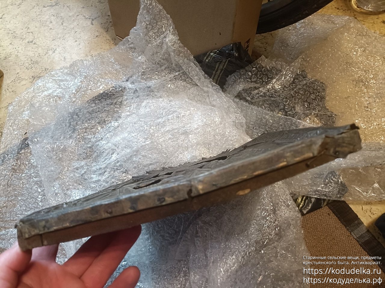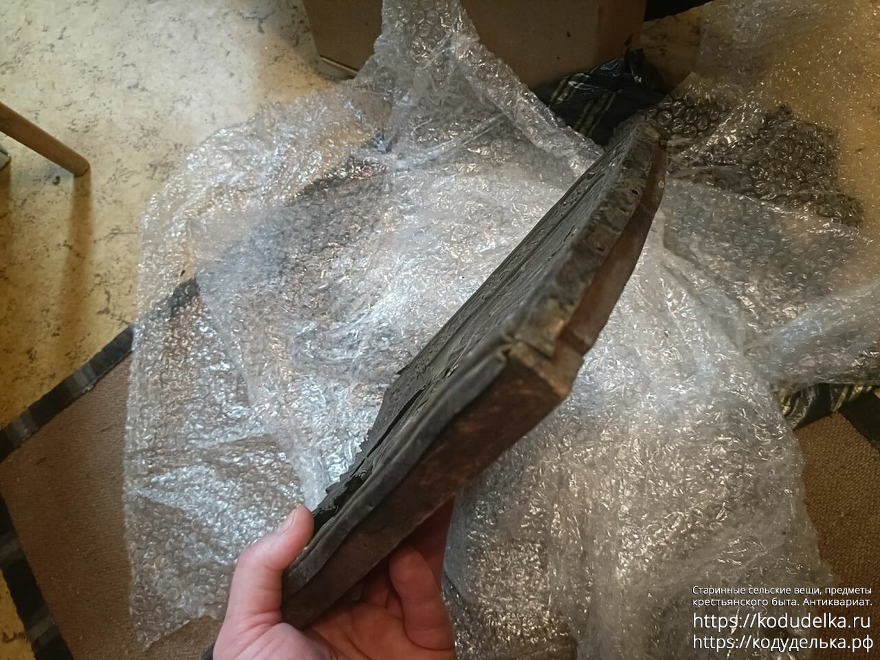 Икона без шпонок, доску повело «корытом» (+ ошиблись стороной написания, с точки зрения расположения волокон).