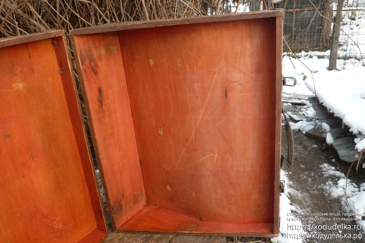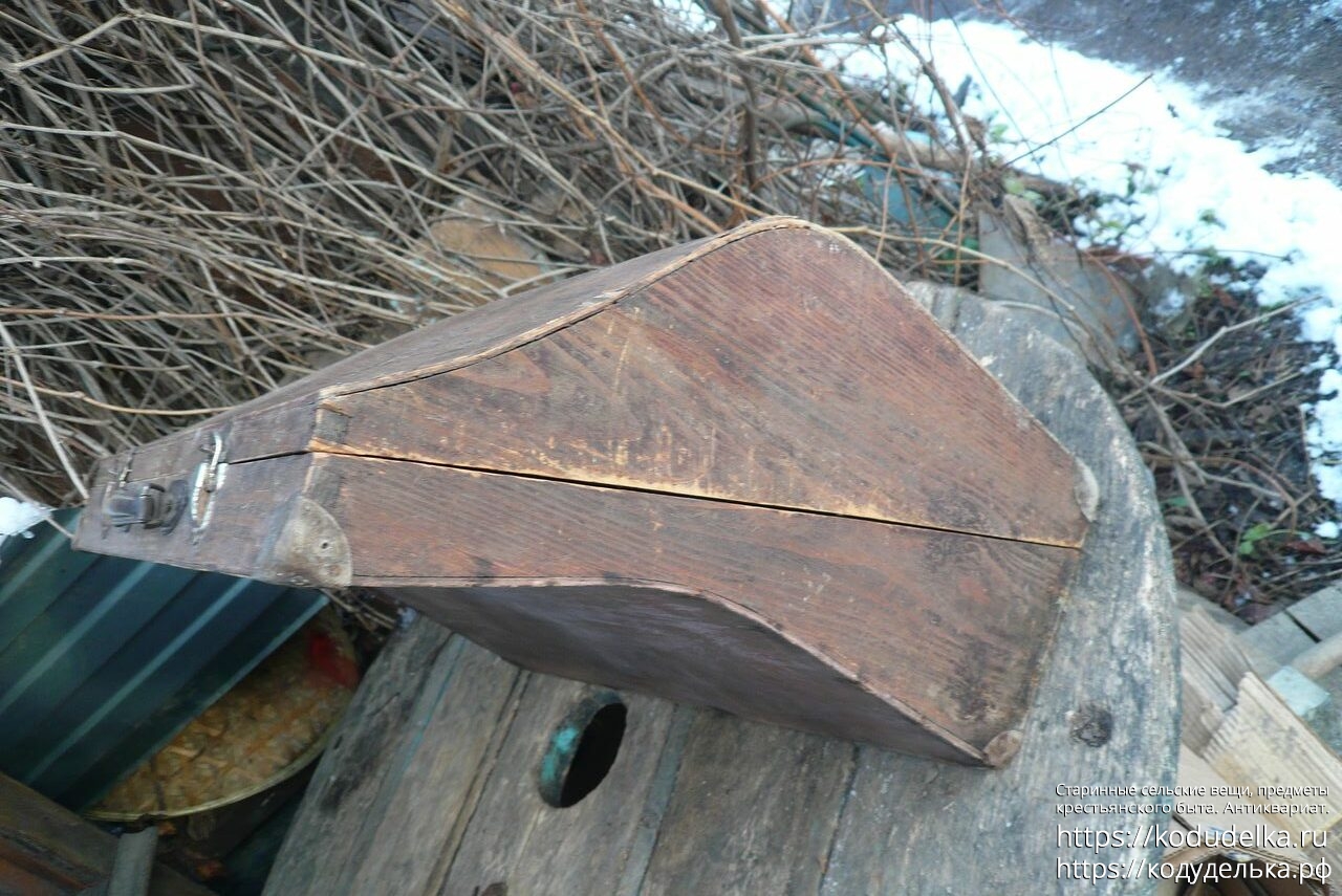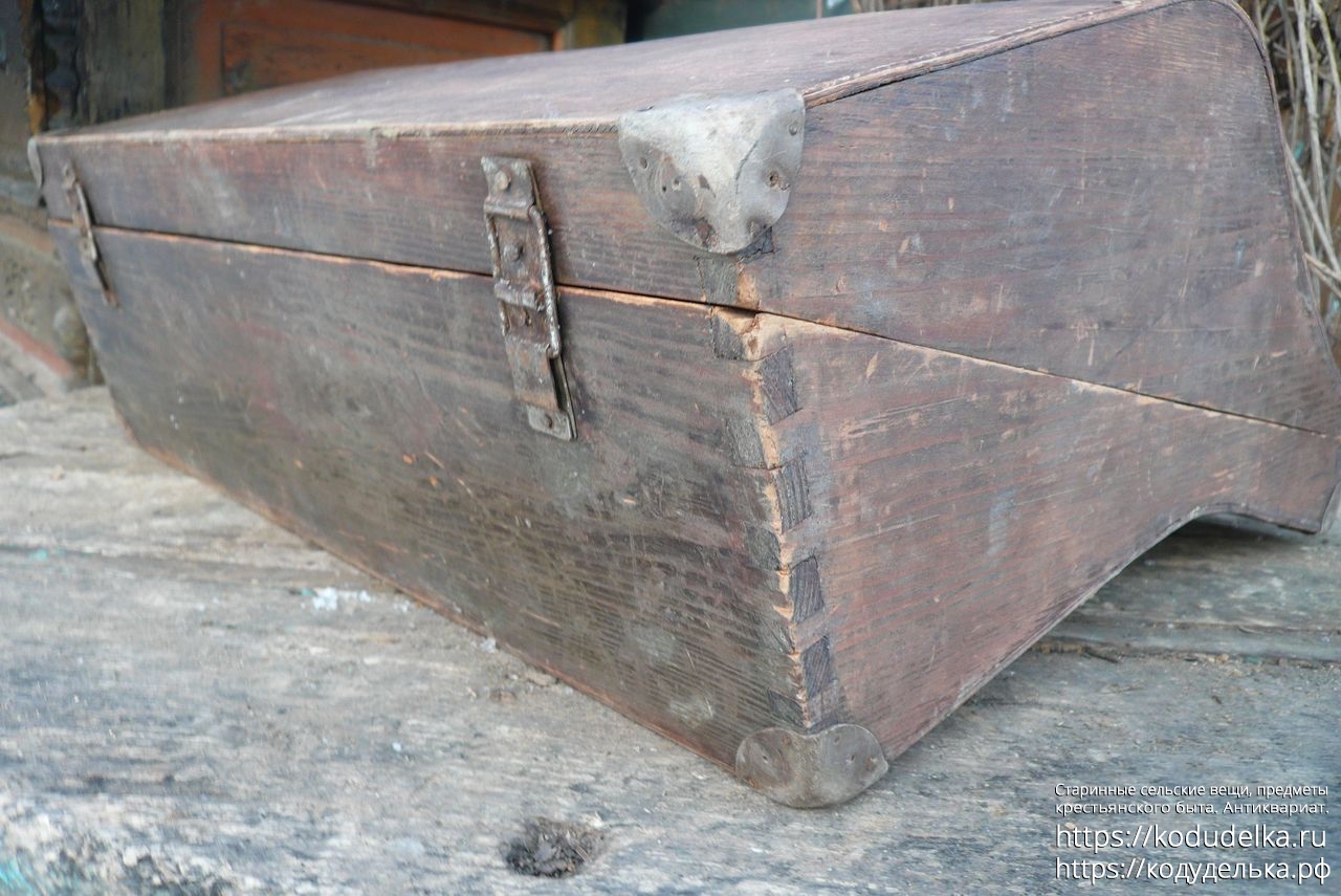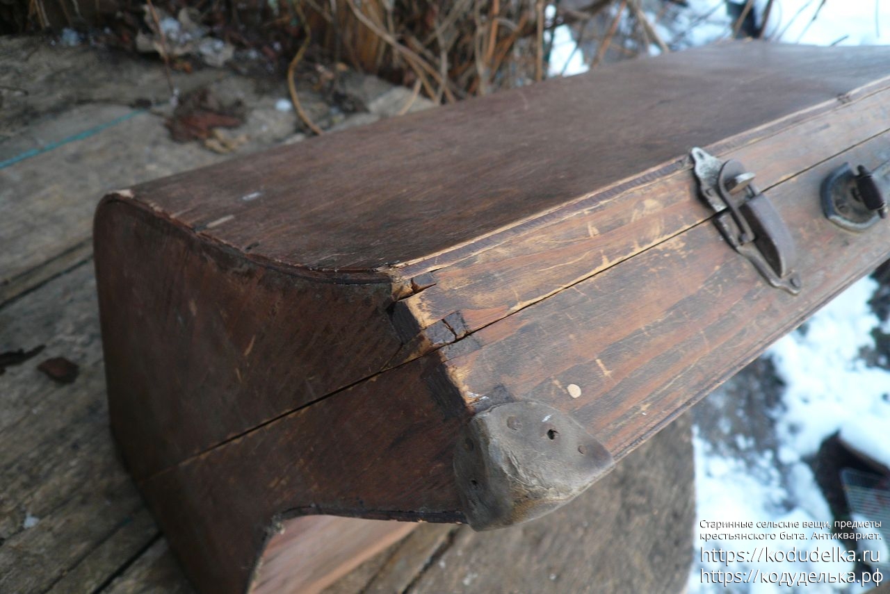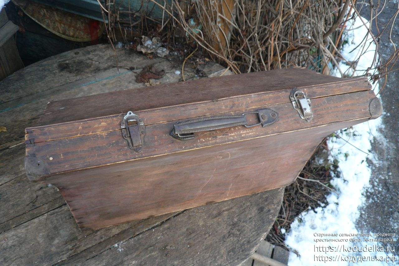 Старинный кофр — массив (пазы входят друг в друга, как скрещенные пальцы) — из-под музыкального инструмента — предположительно аккордеона (либо же для баяна, гармонь, судя по строению, исключается).