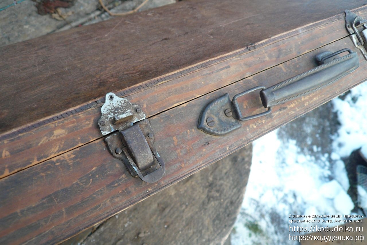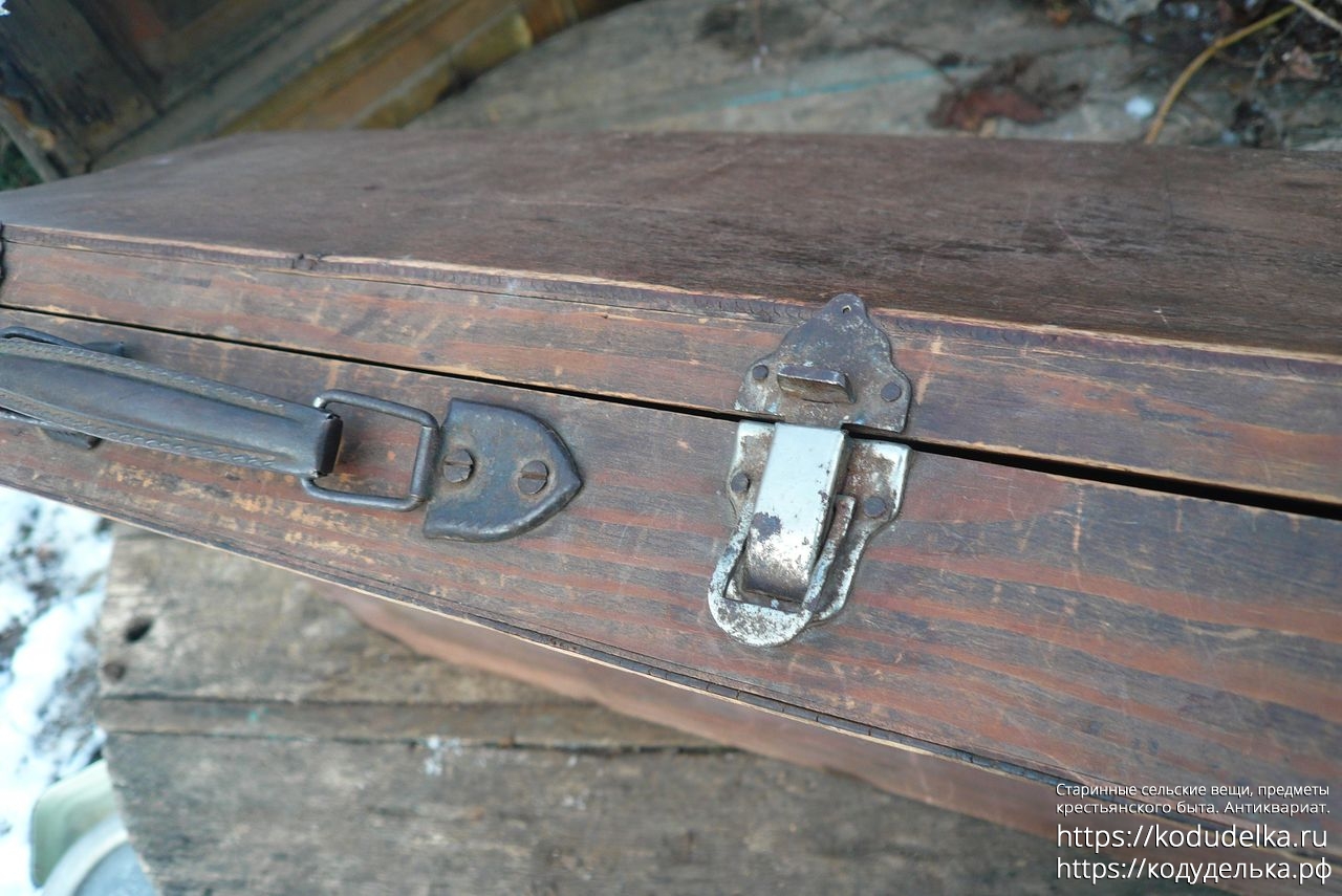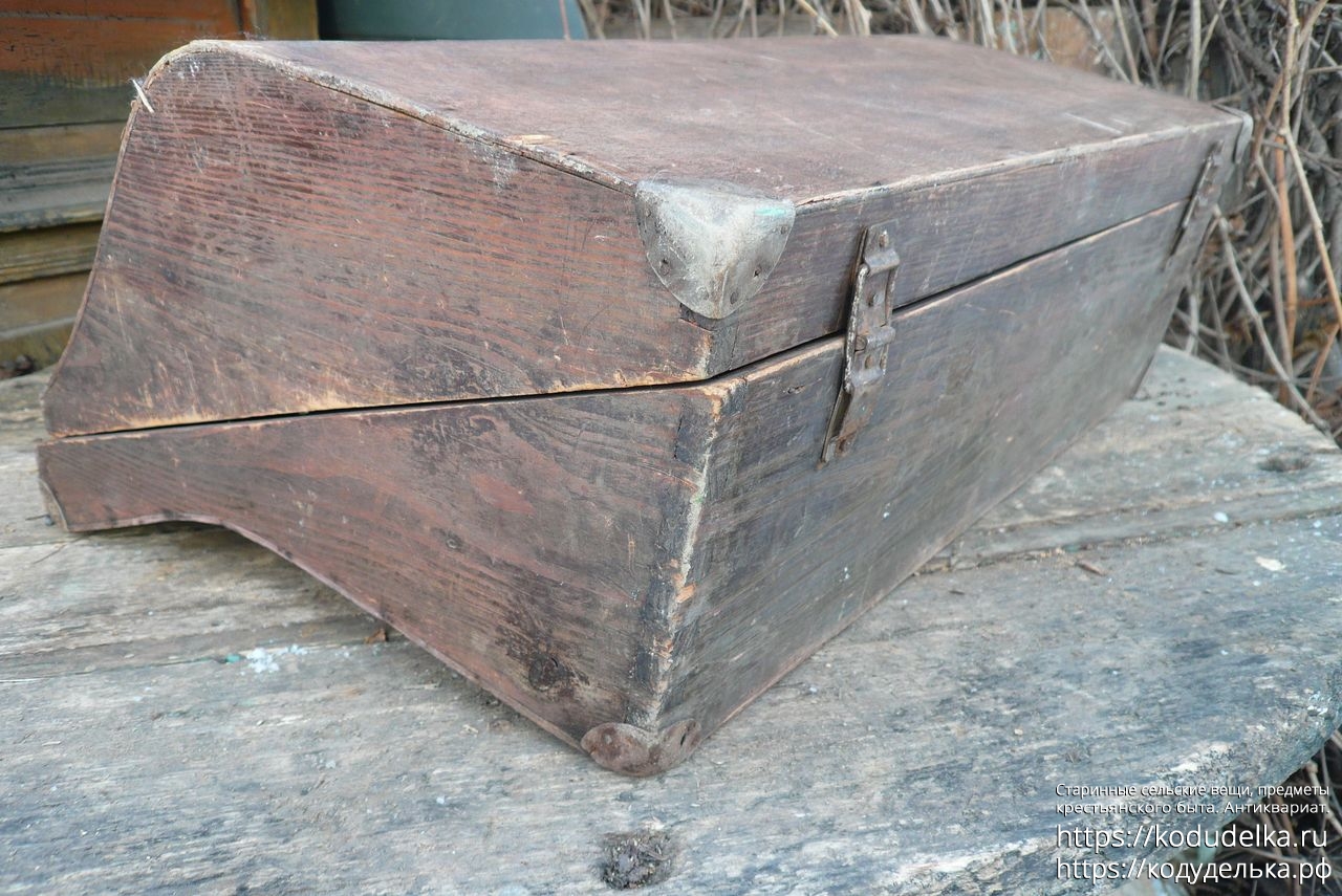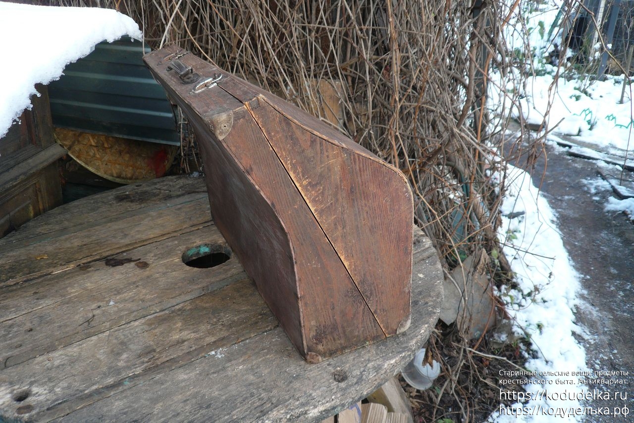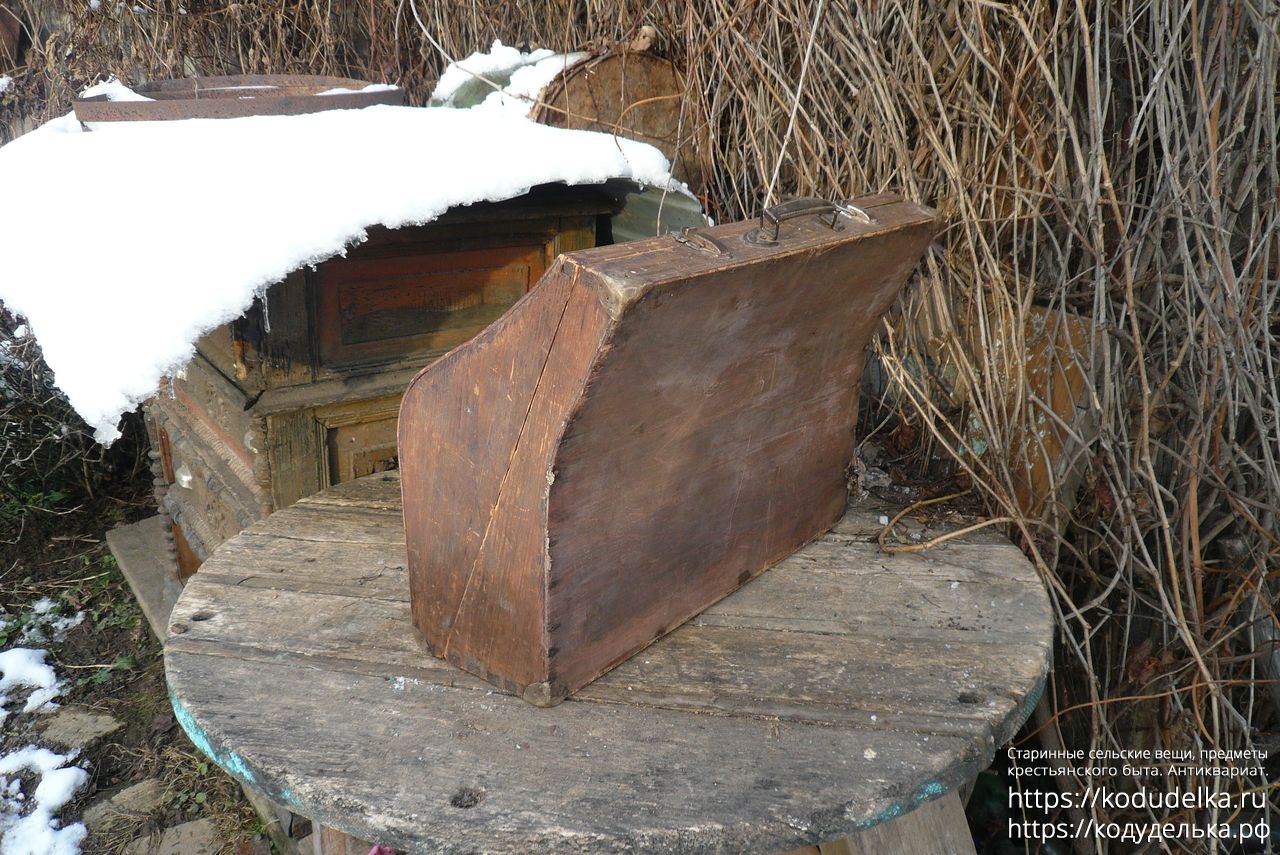Старинный кофр — массив (пазы входят друг в друга, как скрещенные пальцы) — из-под музыкального инструмента — предположительно аккордеона (либо же для баяна, гармонь, судя по строению, исключается).