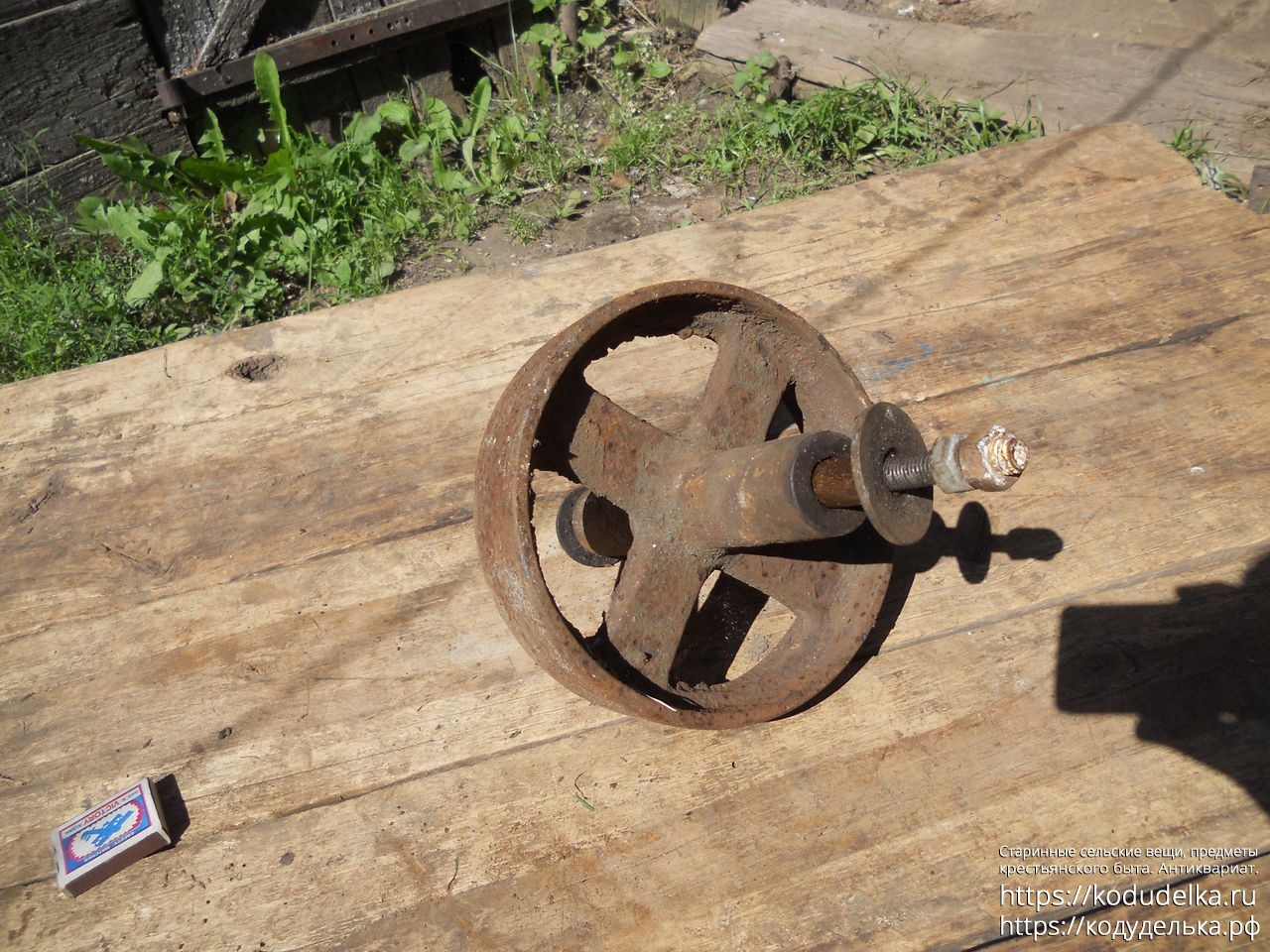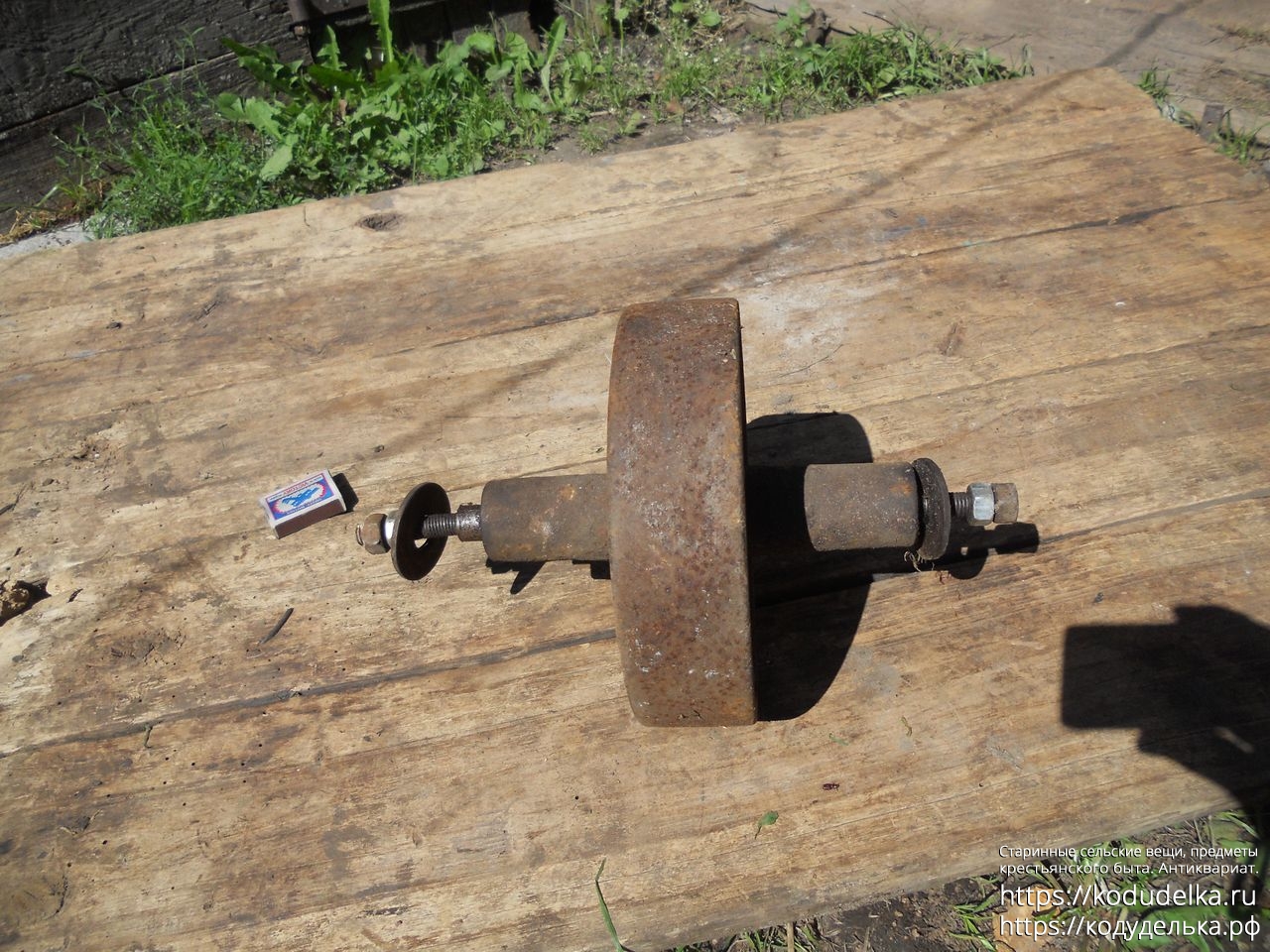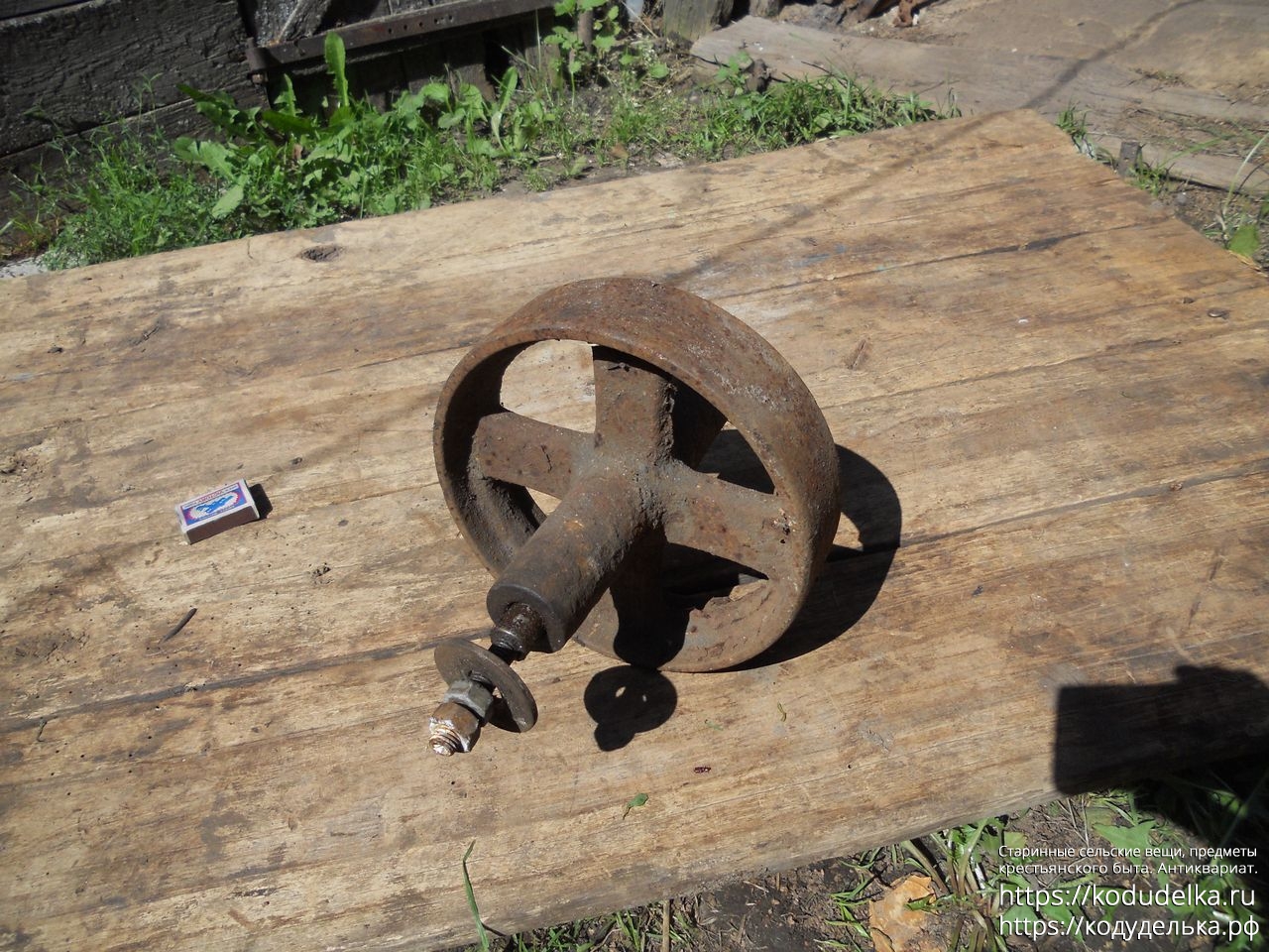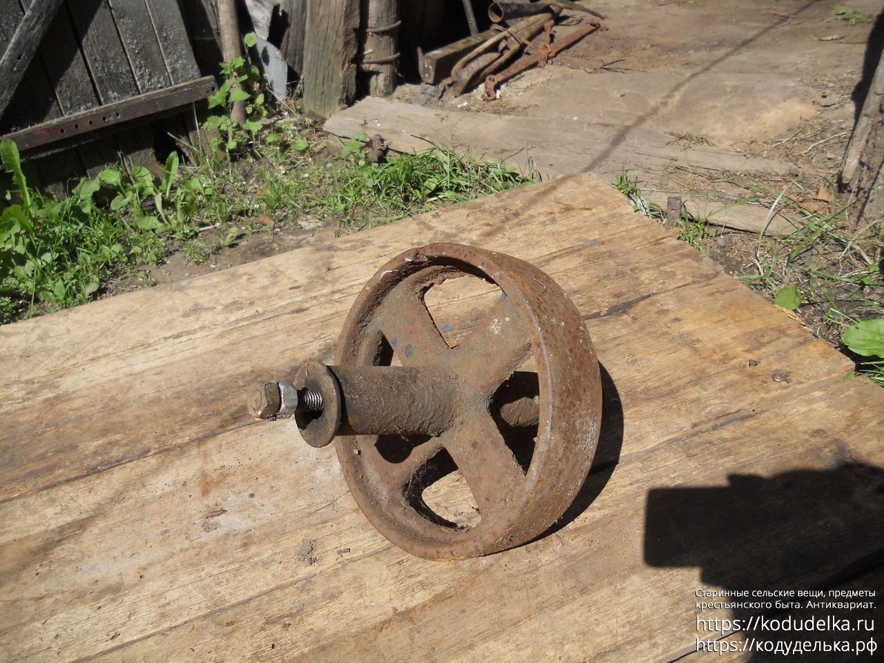 Полностью железное литое (? сварное ?) колесо от старинной одноколёсной тачки (тачанки, тележки), с осью + внутренняя ось с резьбой и гайками, то есть колесо «в сборе».