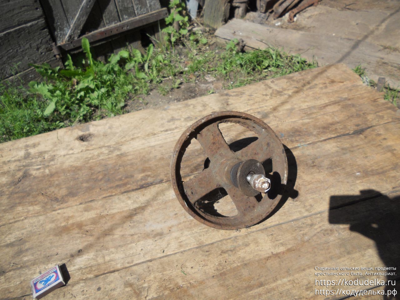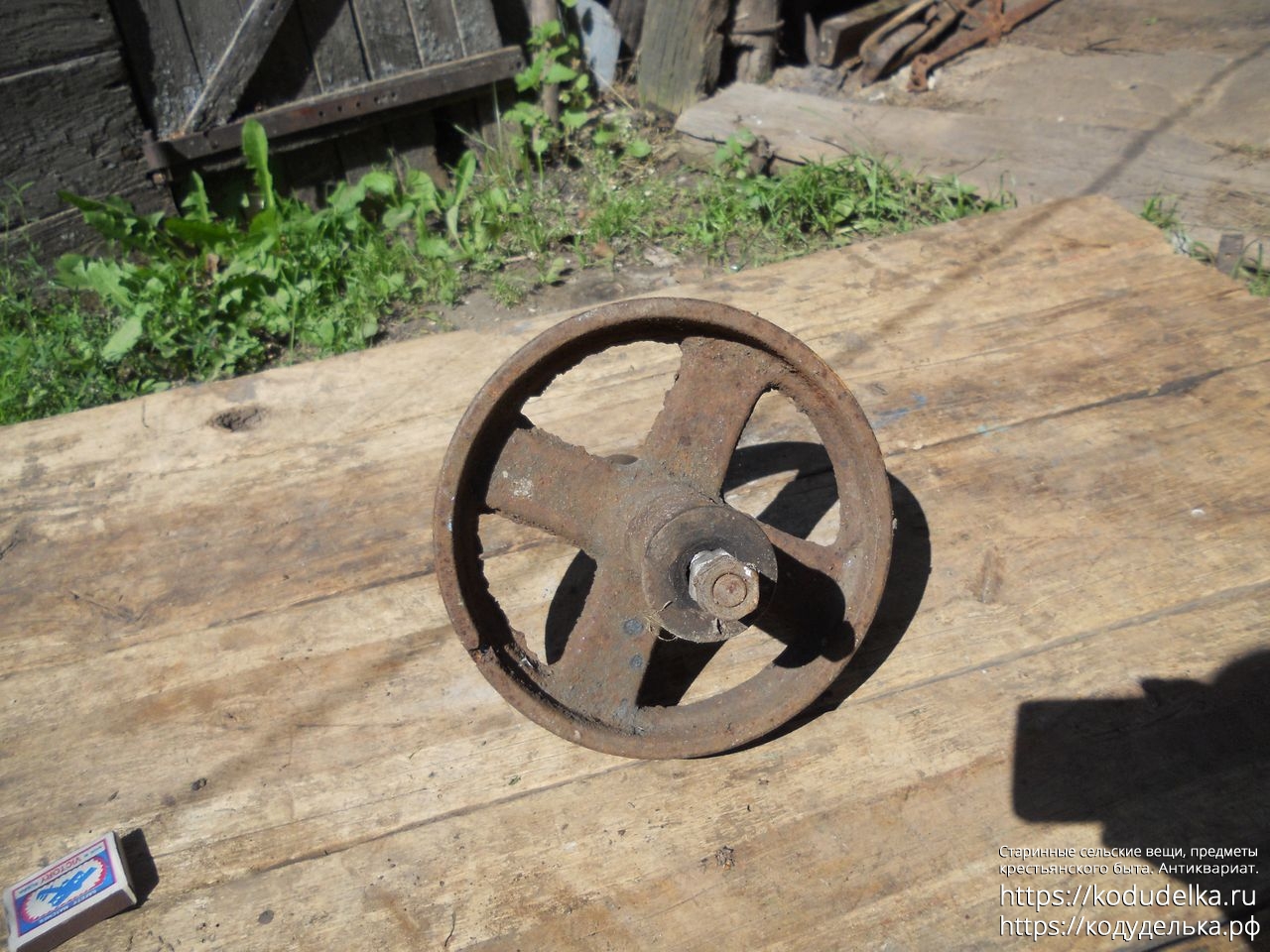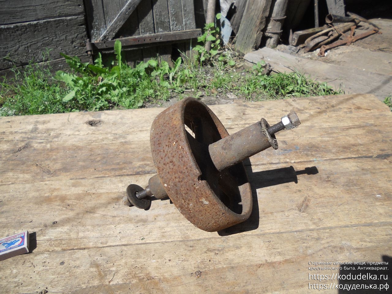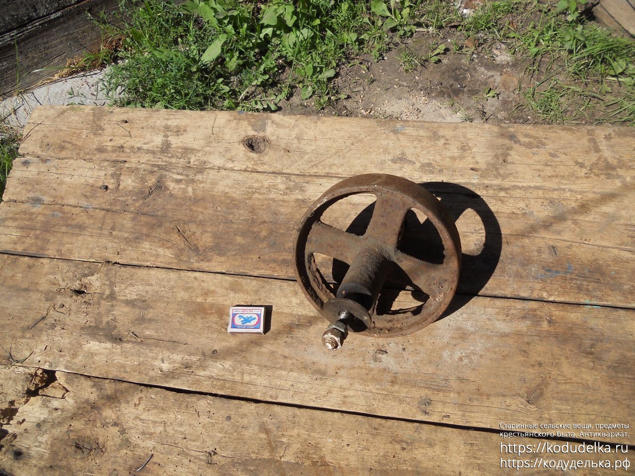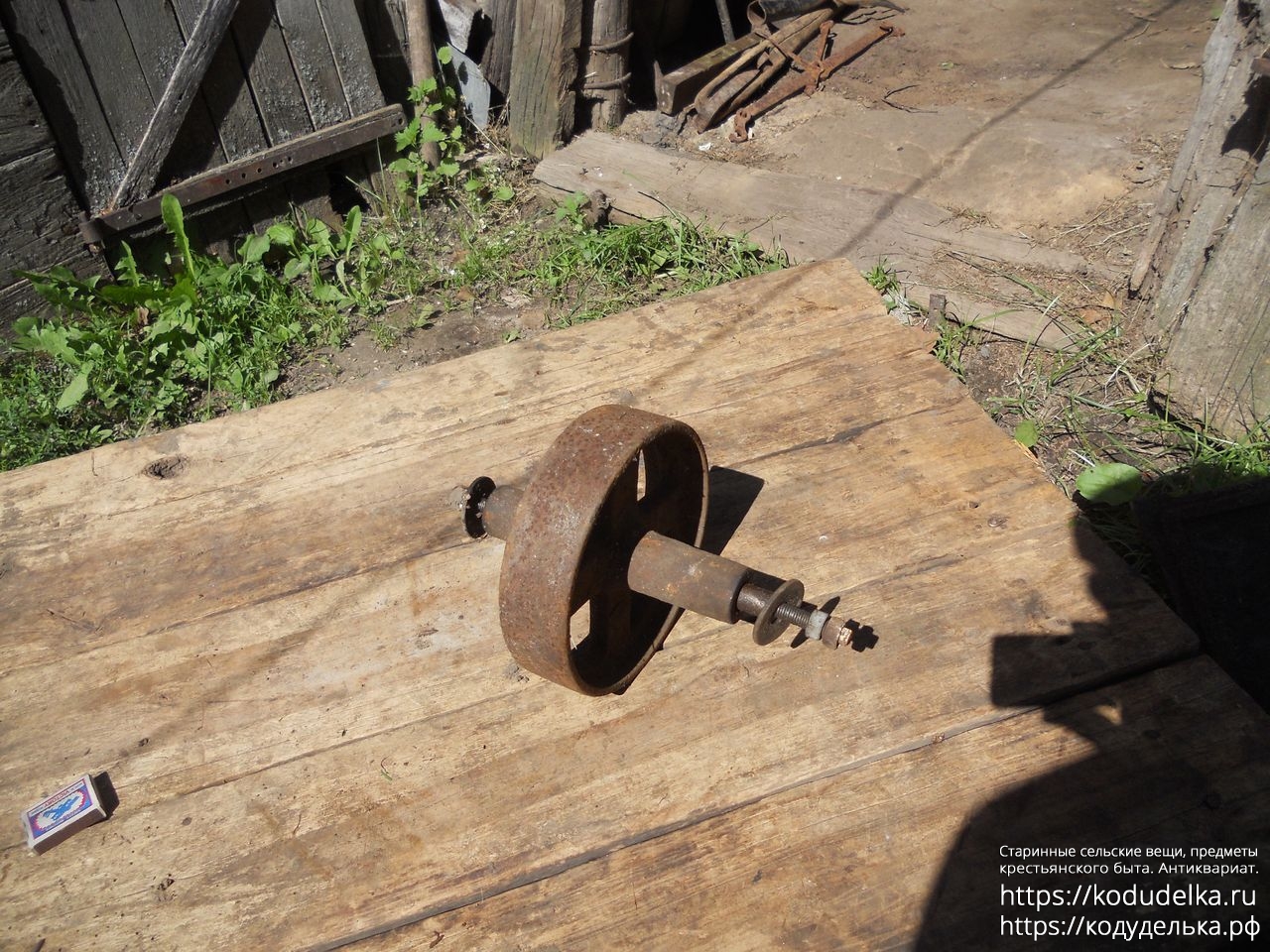 Полностью железное литое (? сварное ?) колесо от старинной одноколёсной тачки (тачанки, тележки), с осью + внутренняя ось с резьбой и гайками, то есть колесо «в сборе».
