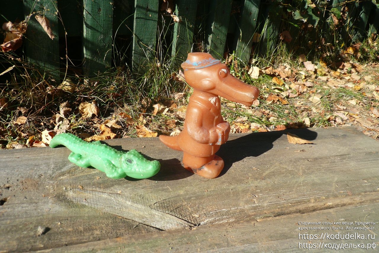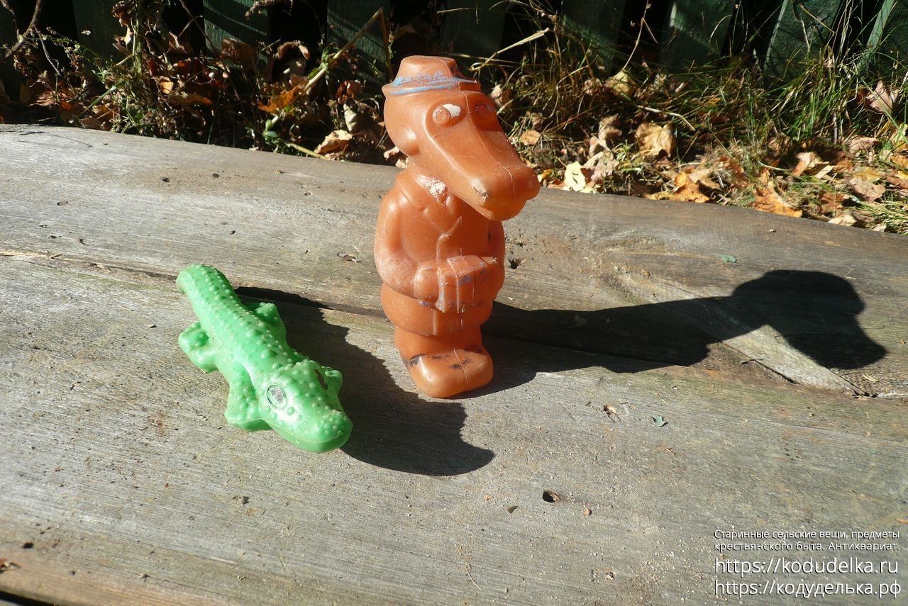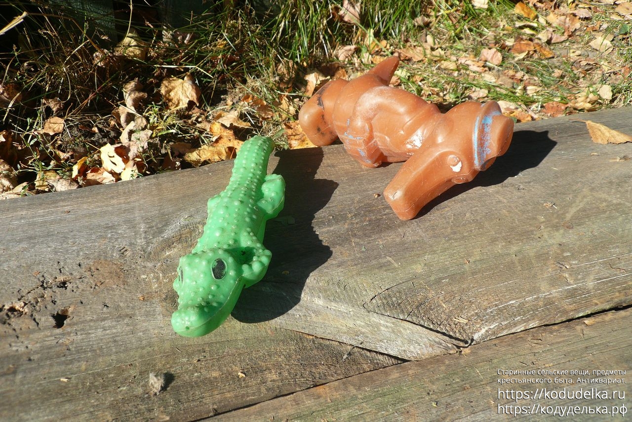 Советские игрушки дутыши из пластмассы — крокодил Гена с гармошкой (Вятка) и просто зелёный крокодильчик.