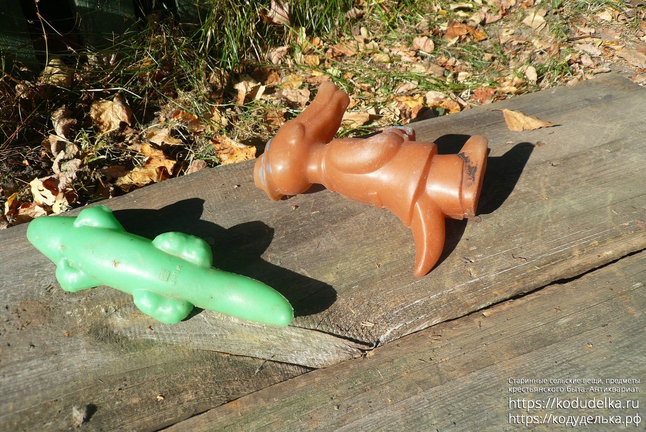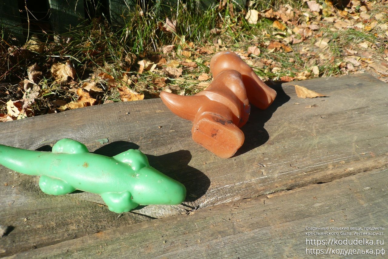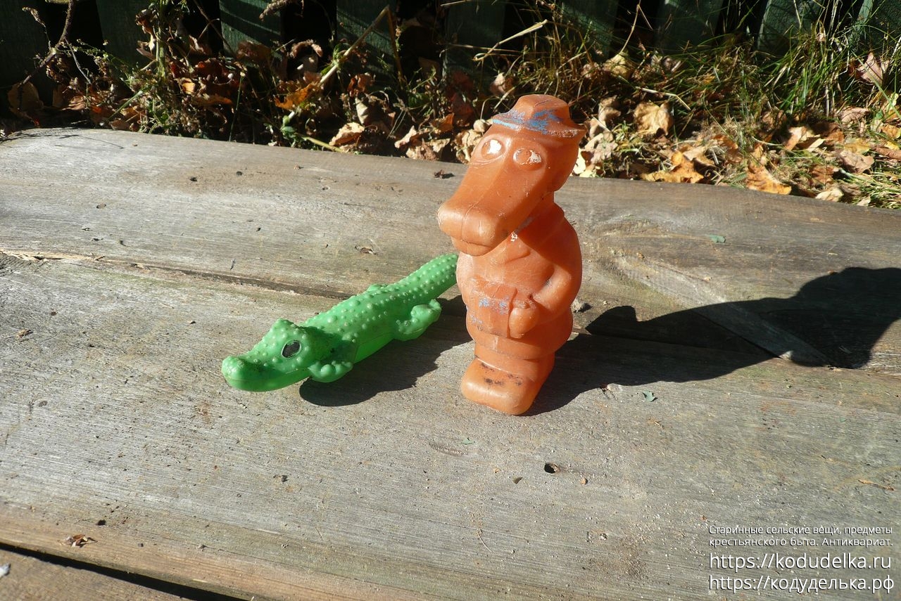 Советские игрушки дутыши из пластмассы — крокодил Гена с гармошкой (Вятка) и просто зелёный крокодильчик.