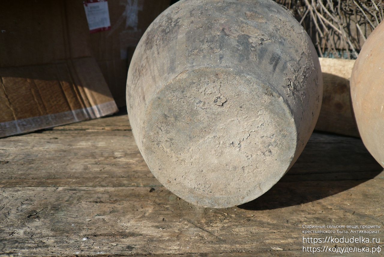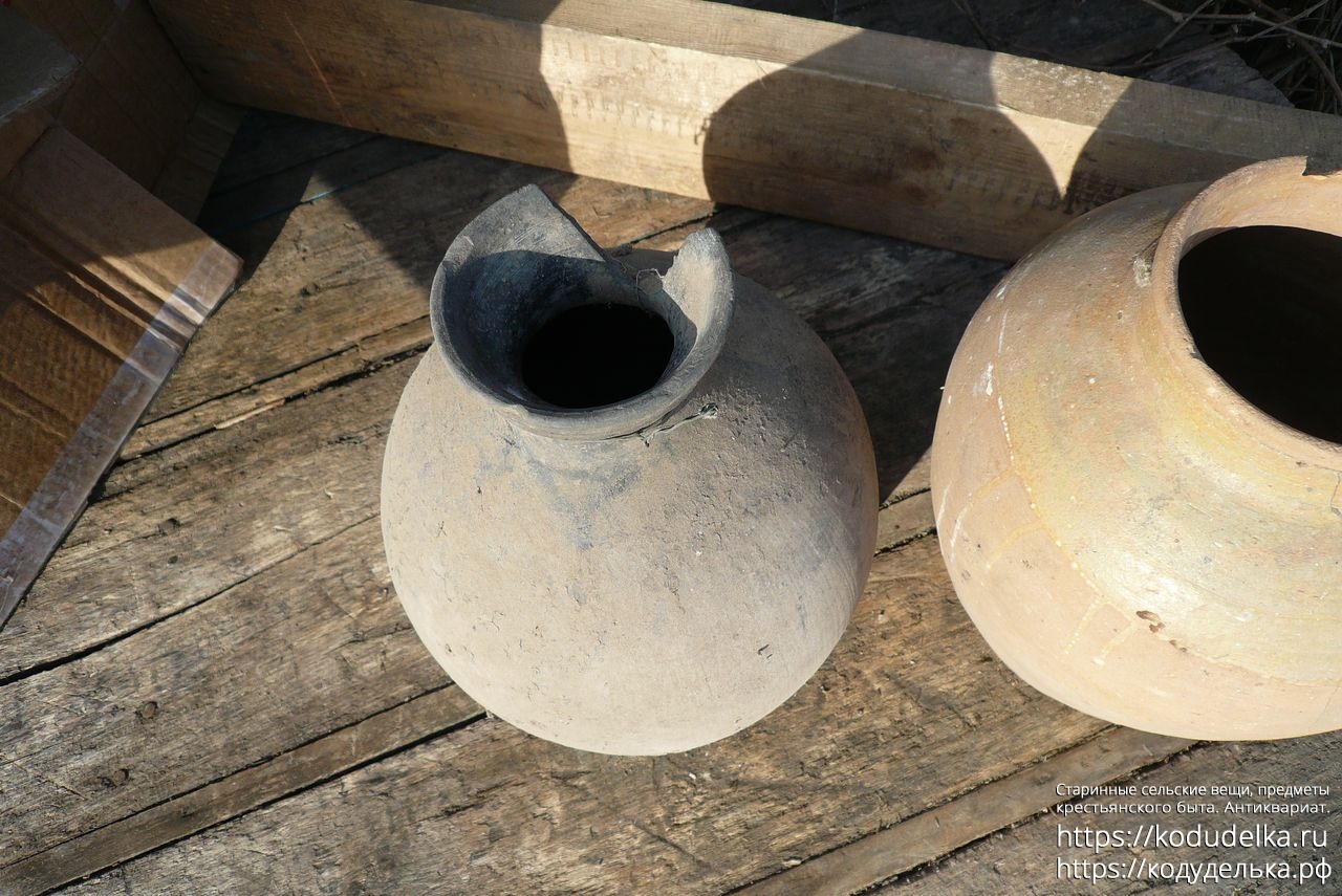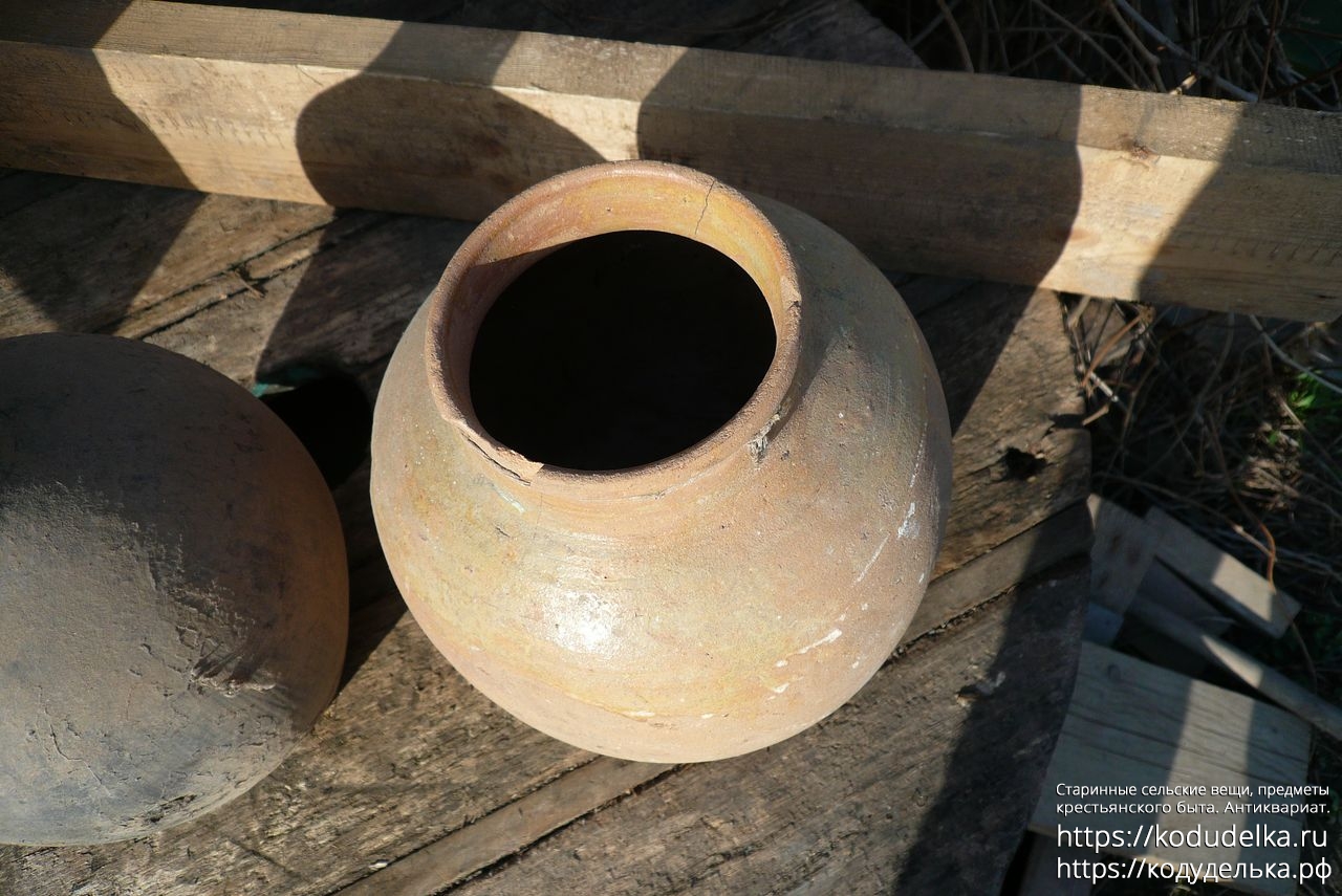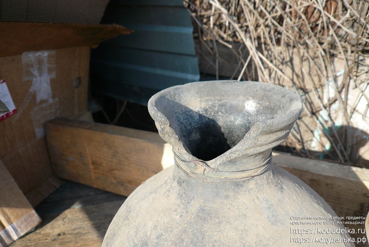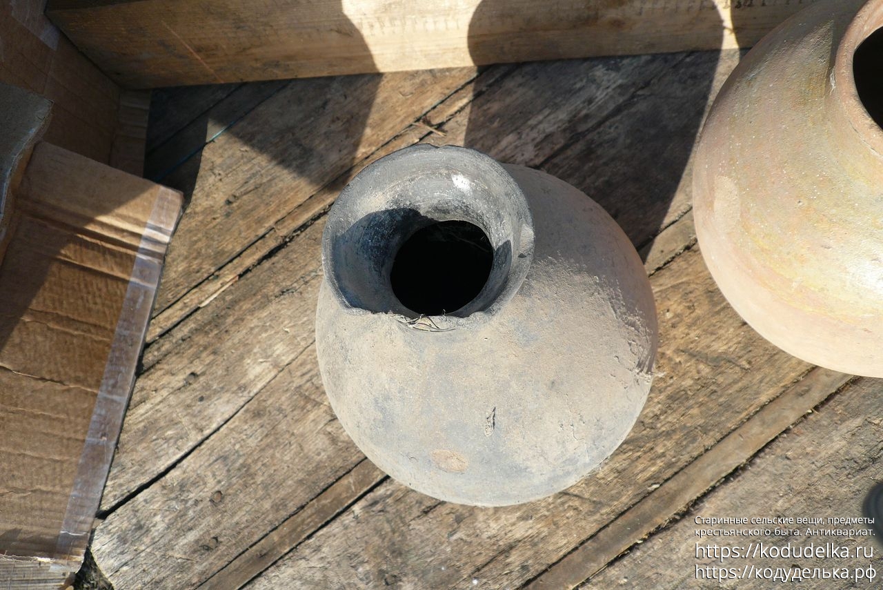 2) У тёмного кувшина из чёрной глины есть скол по ободку горловины.