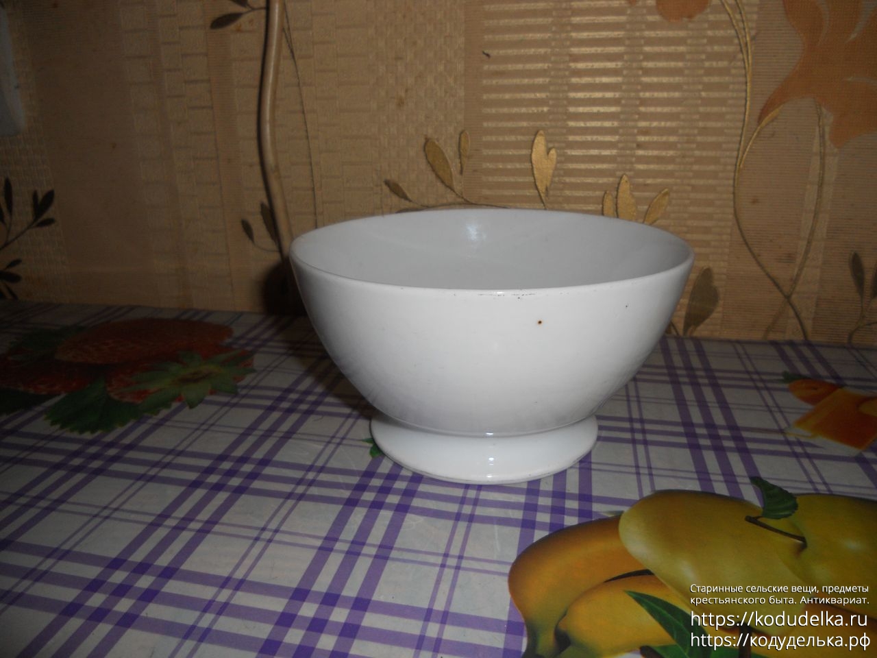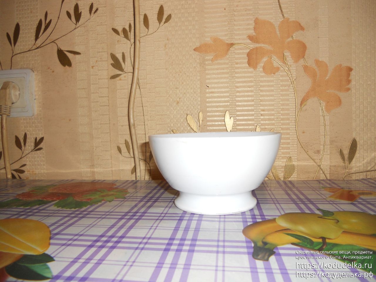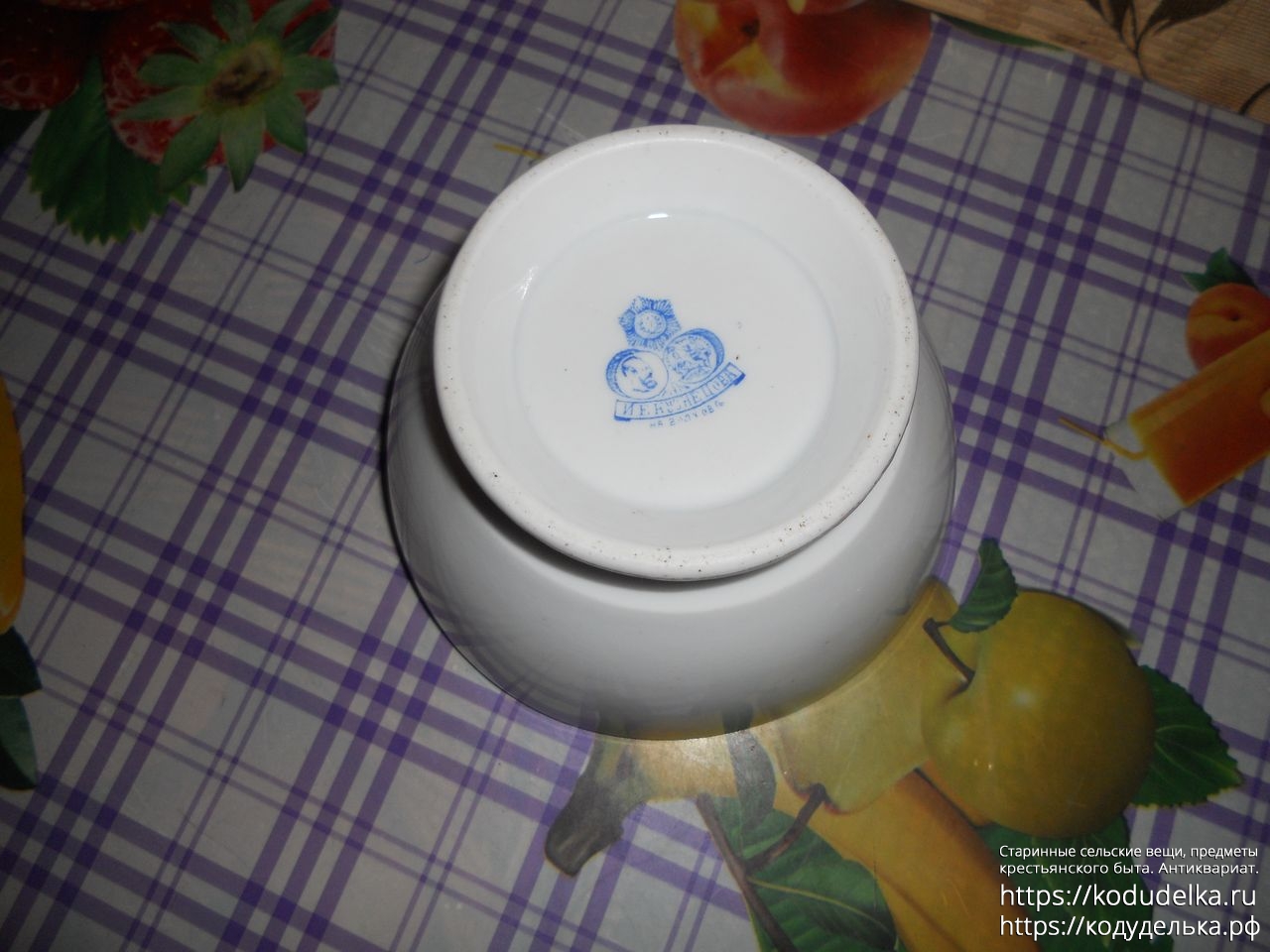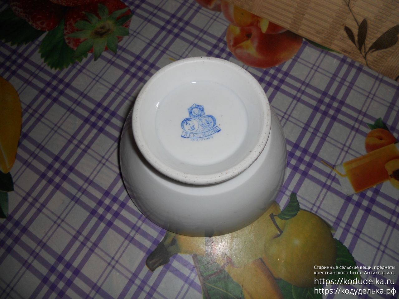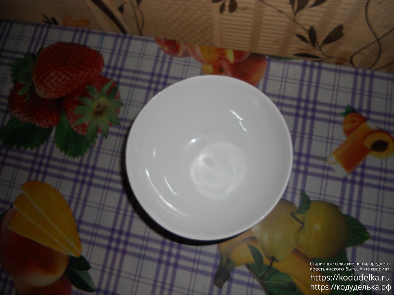 Есть пара малозаметных малых темных пятнышек (изначальные дефекты при создании). В целом пиала белая, в хорошем состоянии, когда берешь в руки — нет ощущения, что она «пожившая» (это моё субъективное мнение, основанное на сравнении с другими попадавшимися мне предметами посуды тех времён).