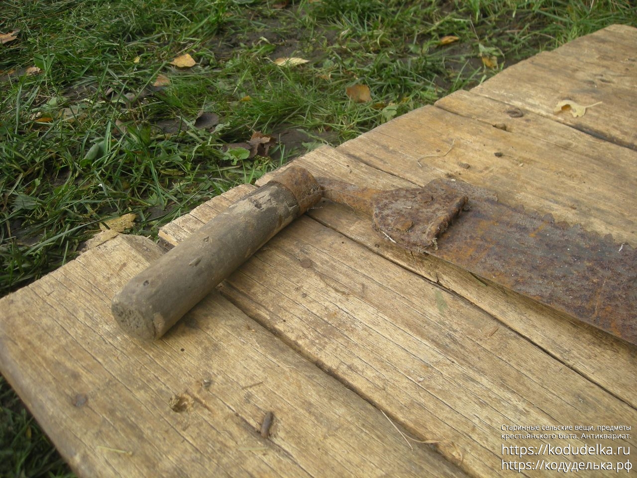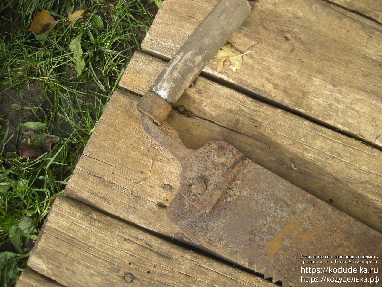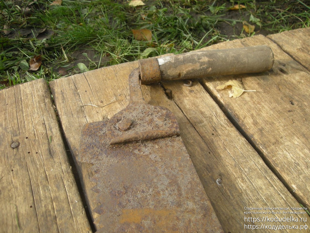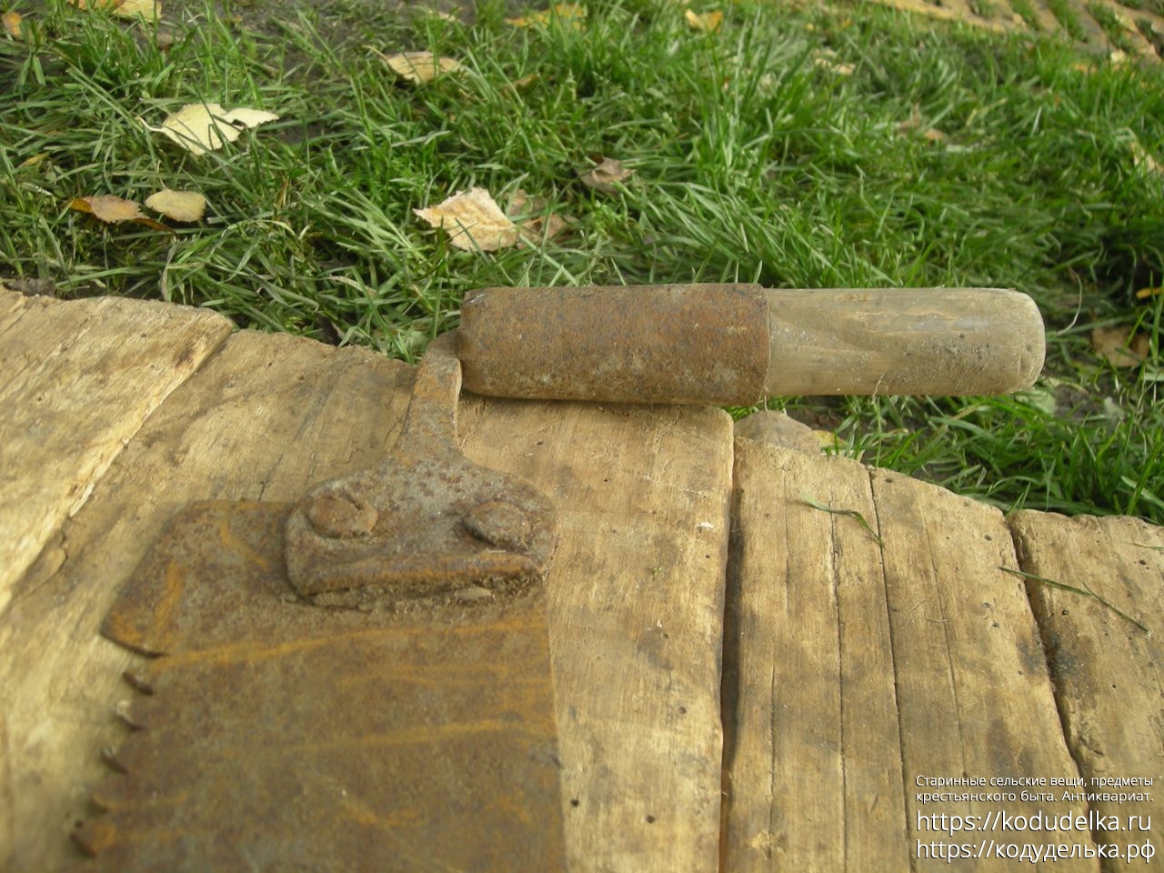 Из необычного — ручки на клиньях, но вынесены на отдельных Г-образных клиньях вбок (обычно у подобных пил подобный клин просто приклёпан к полотну). Также часть от клёпки этого клина, та часть, что непосредственно крепится к полотну — загнут полукругом (не знаю, видно ли на фото). Можно было бы списать на то, что от регулярной силовой работы край «завернулся», но… мне кажется, если правильно склепать, вот так вот завернуть металл толщиной порядка 2 мм при работе об дерево, да еще и со всех 4-х сторон сразу проблематично… предположу, что это сделано намеренно, как некий ограничитель в работе.