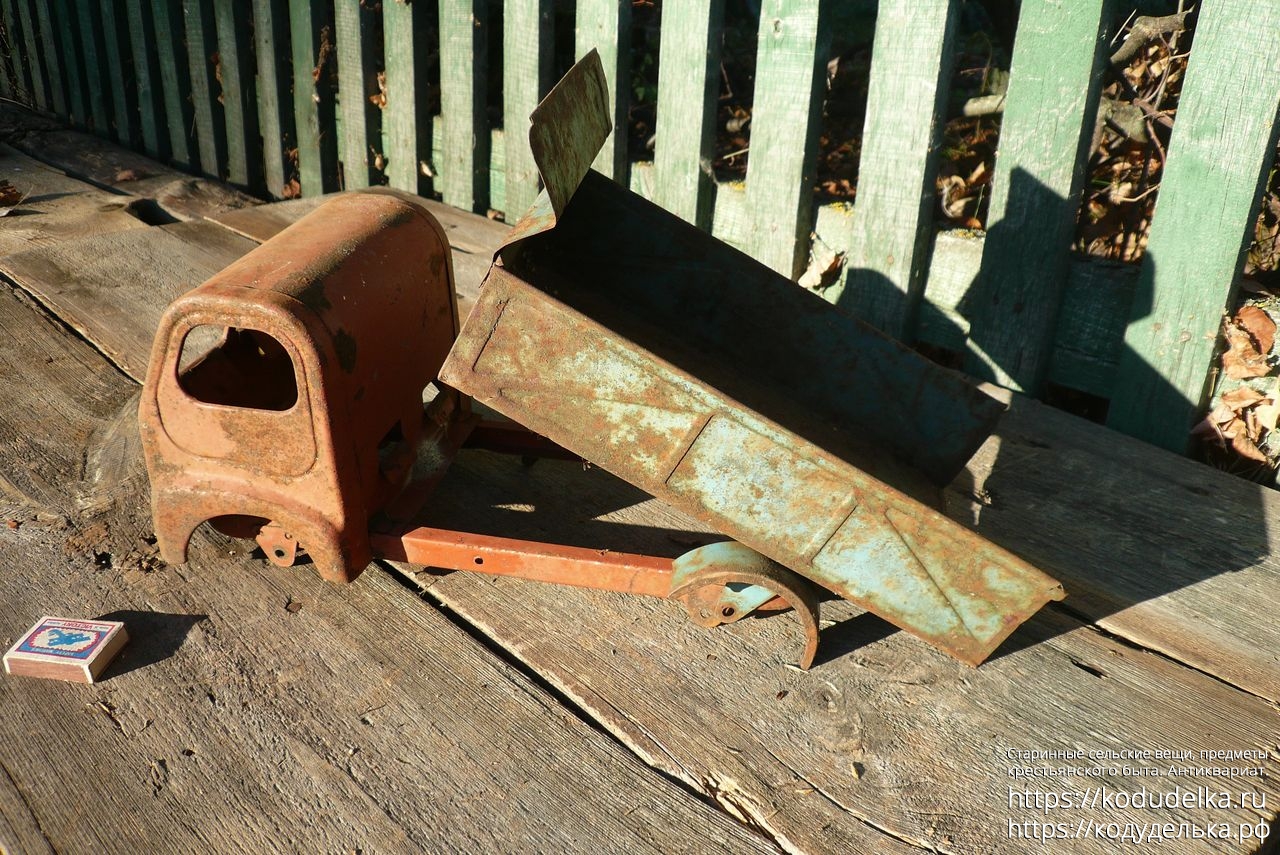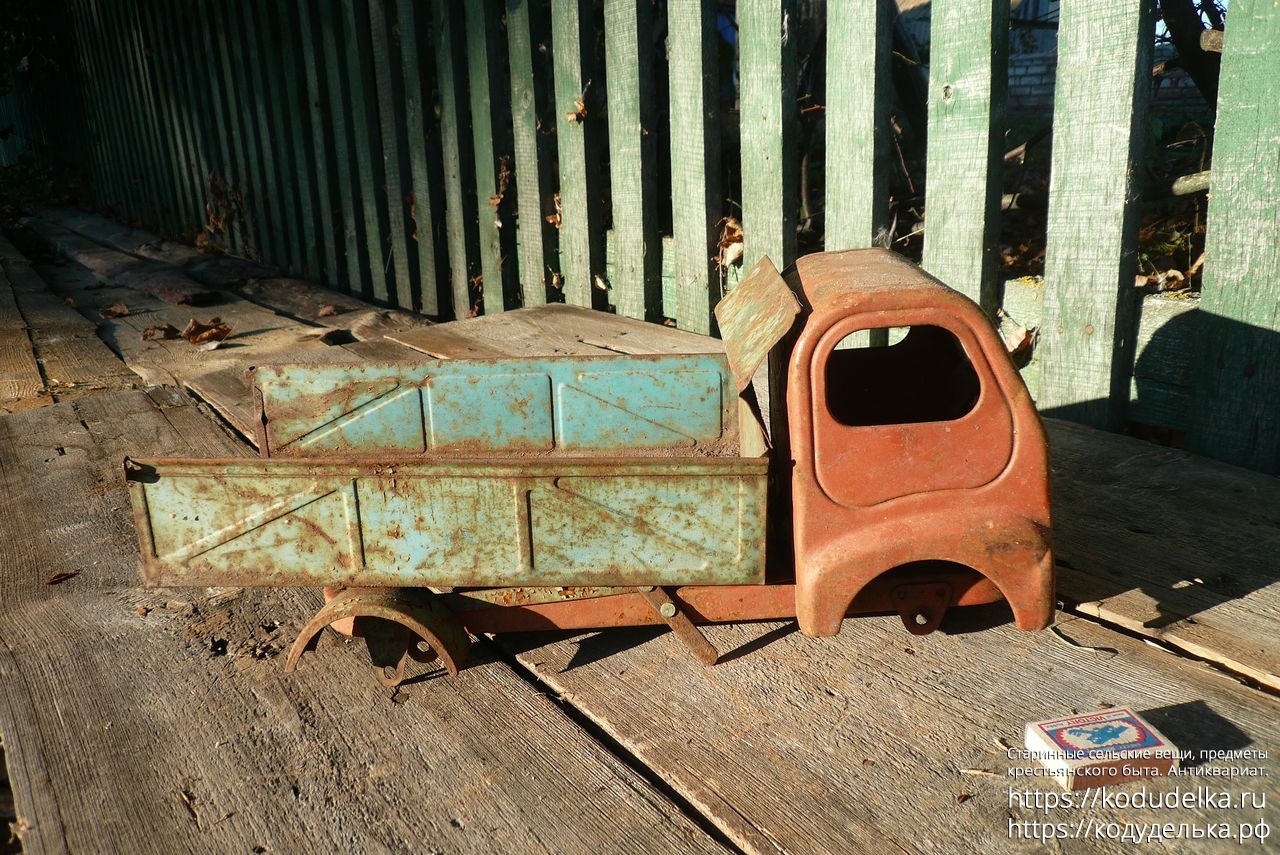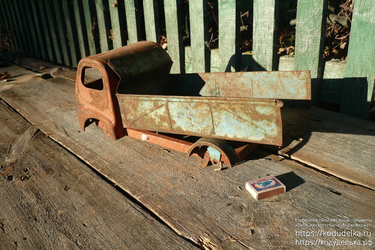 Большая советская жестяная игрушка, игрушечная машина — самосвал, грузовик из жести, на кабине спереди клеймо ЛТЗ.