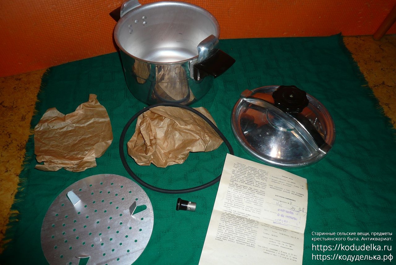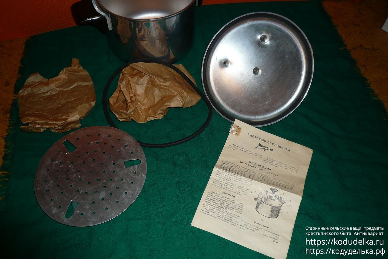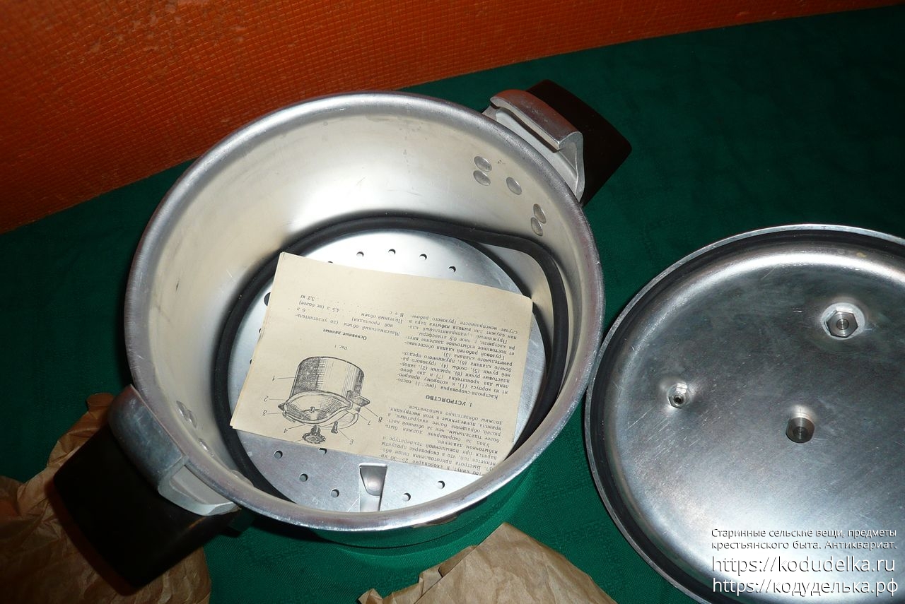 Комплектация: сама кастрюля с крышкой и ручками + клапан с пружинкой + подставка для пароварки, инструкция + запасная уплотнительная резинка